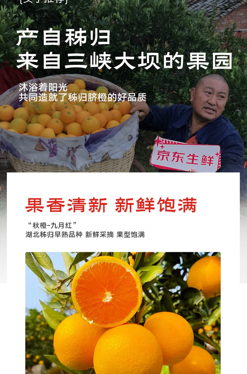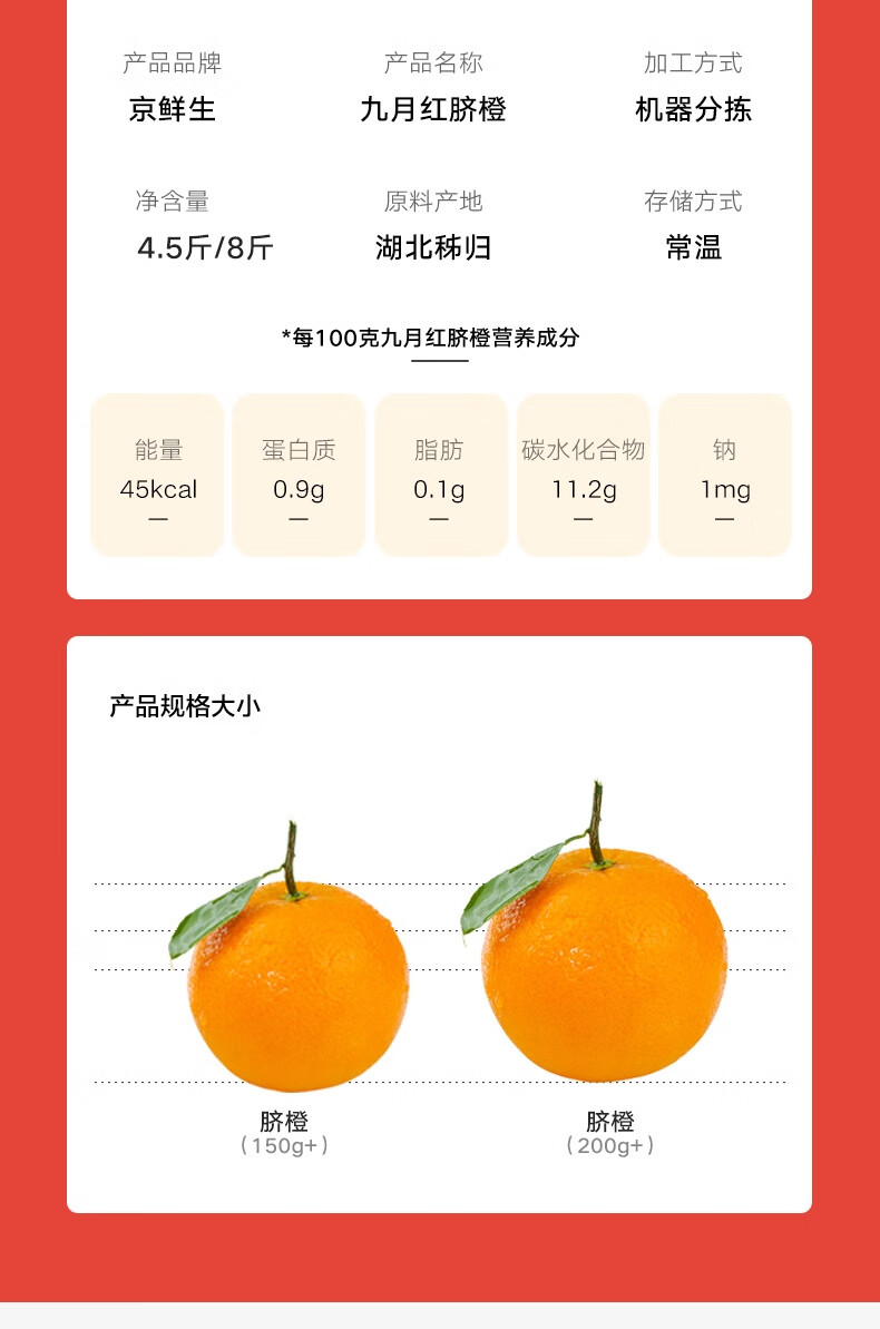 京鲜生 湖北秭归果冻橙九月红脐橙4.5斤单果150g 应季水果源头直发 包邮