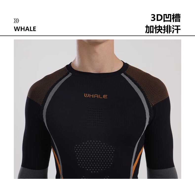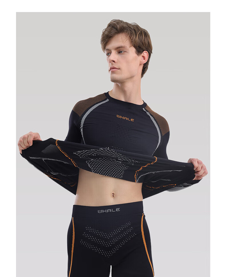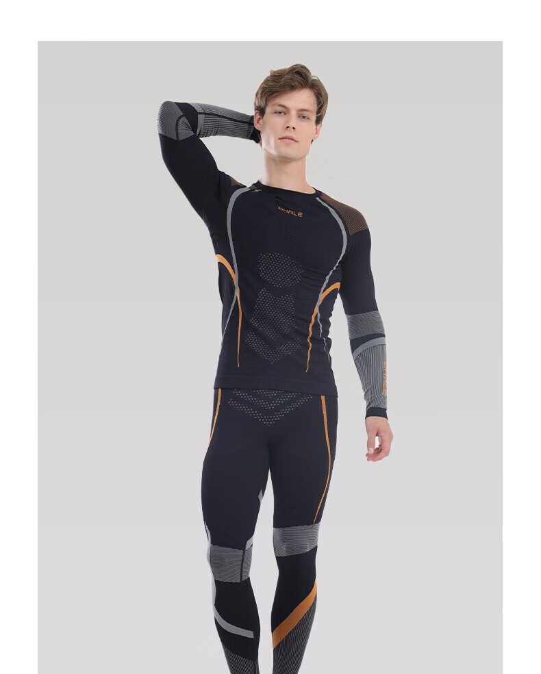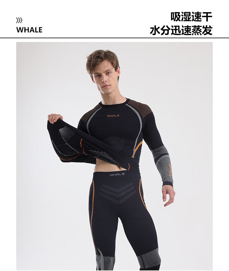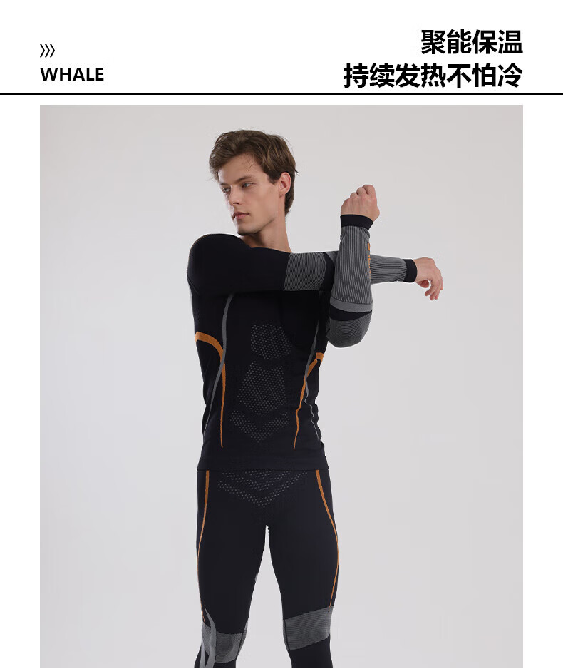 鲸鱼男士速干衣保暖内衣户外运动滑雪保暖套装冬季修身舒适防寒 男款速干保暖衣-黑橙色 M