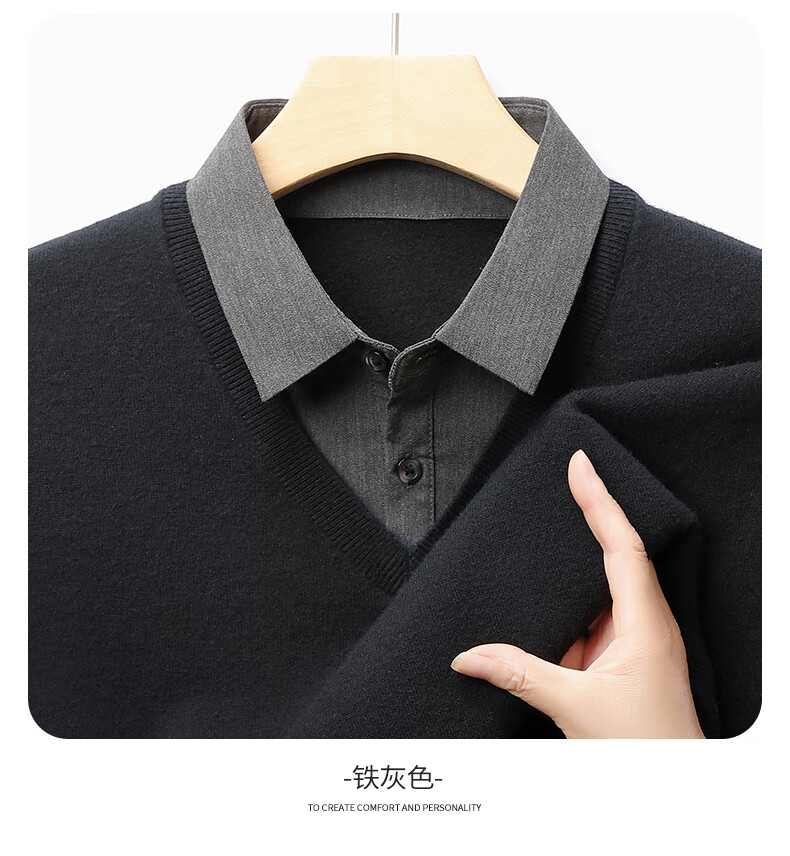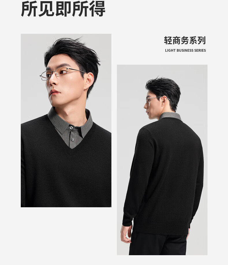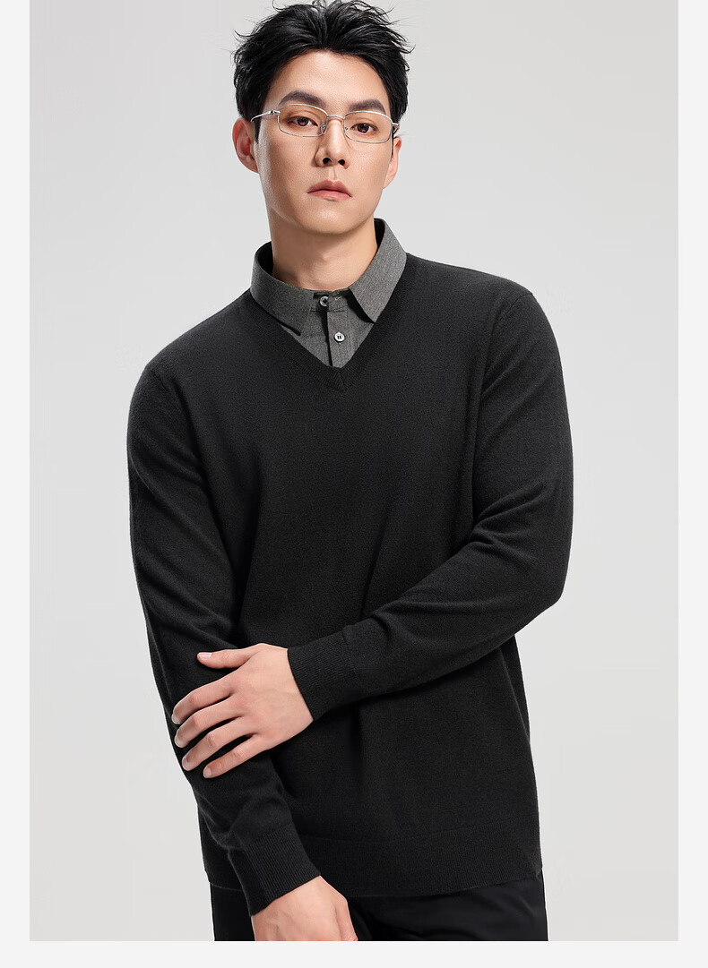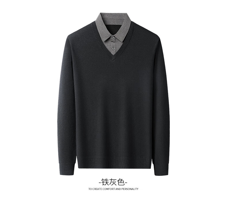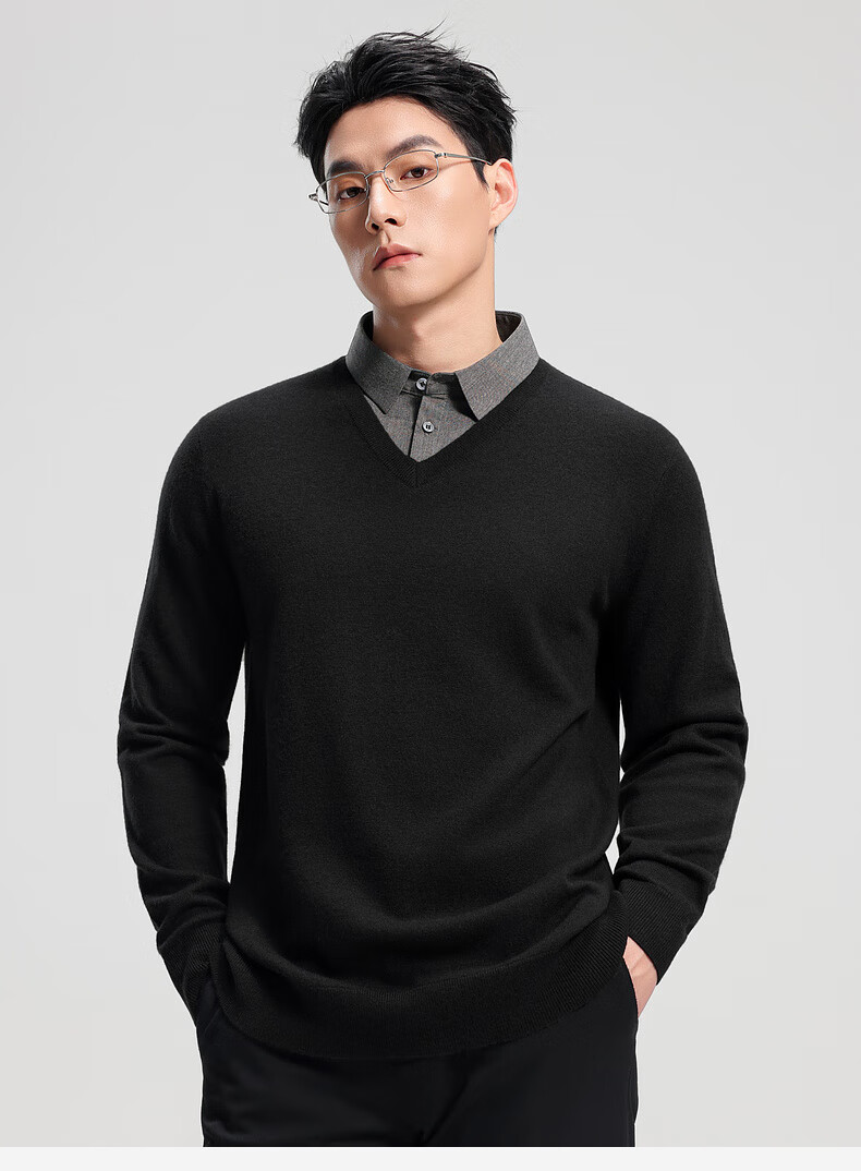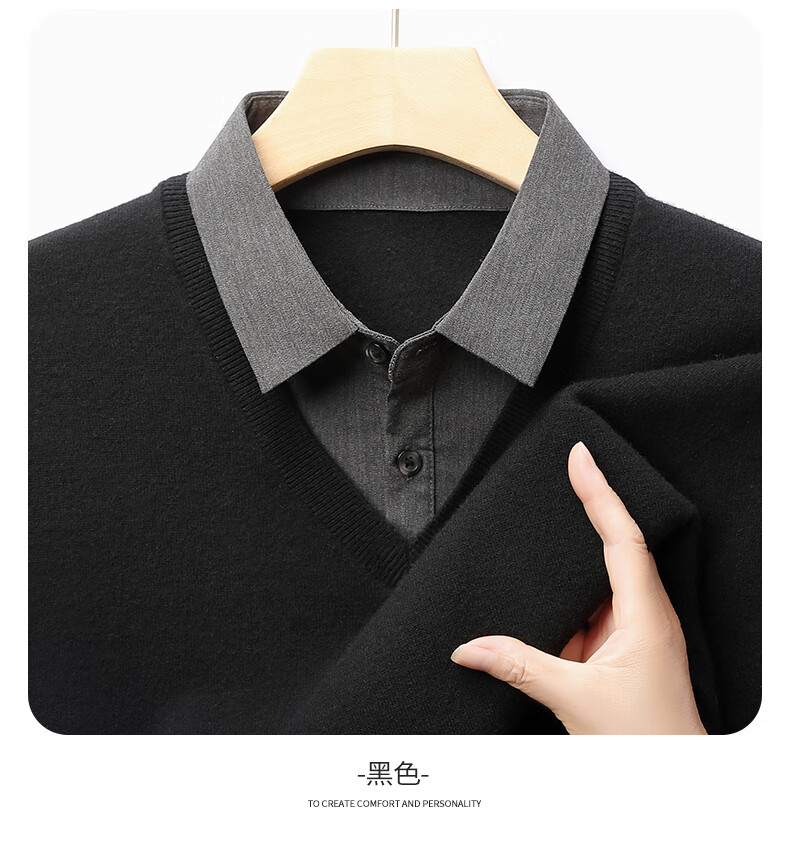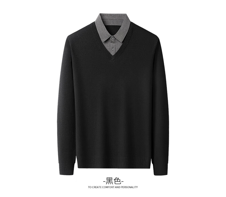 SHANSHAN杉杉【可机洗】绵羊毛衫男秋冬厚款假两件翻领针织衫男士毛衣 黑色 XL /180