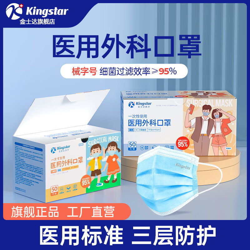 金士达 一次性医用口罩外科口罩 3层防护日常过滤细弹力耳带不勒耳 成人医用外科10只/袋*10袋