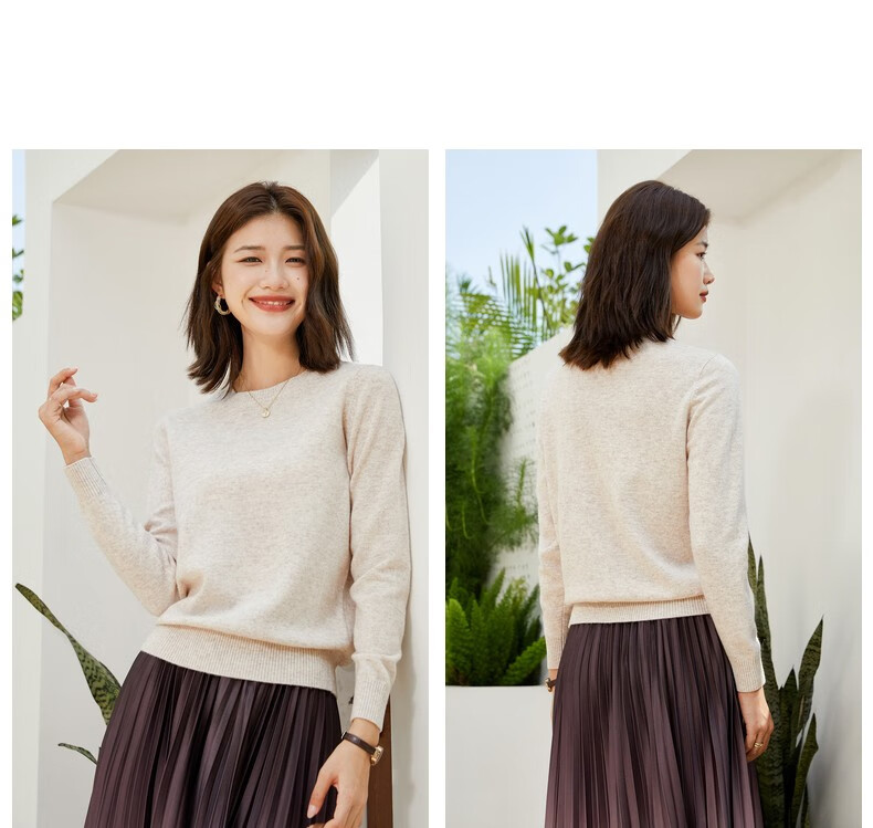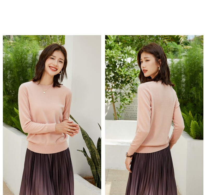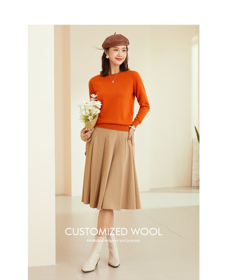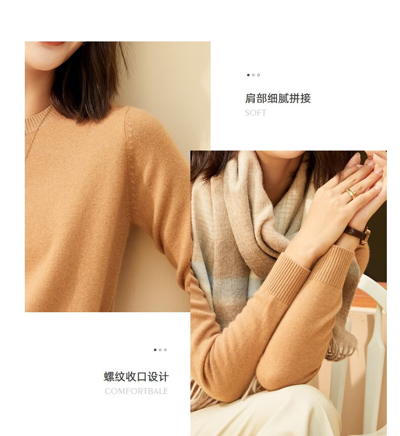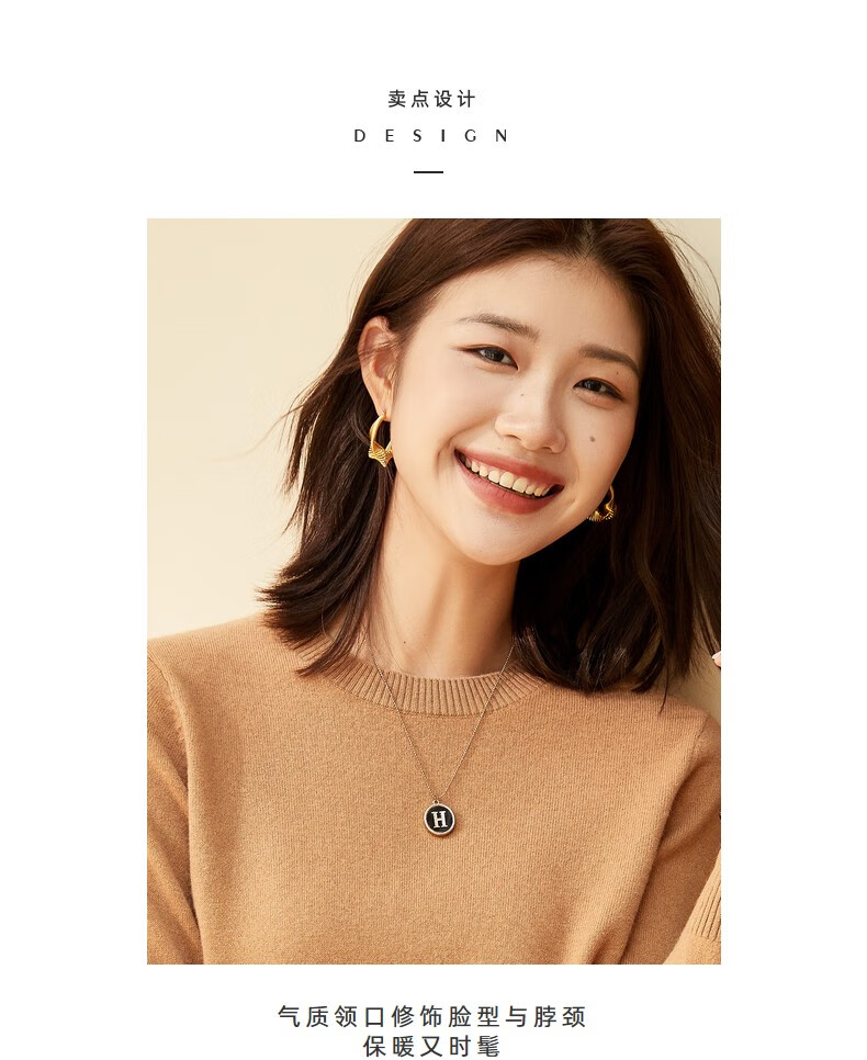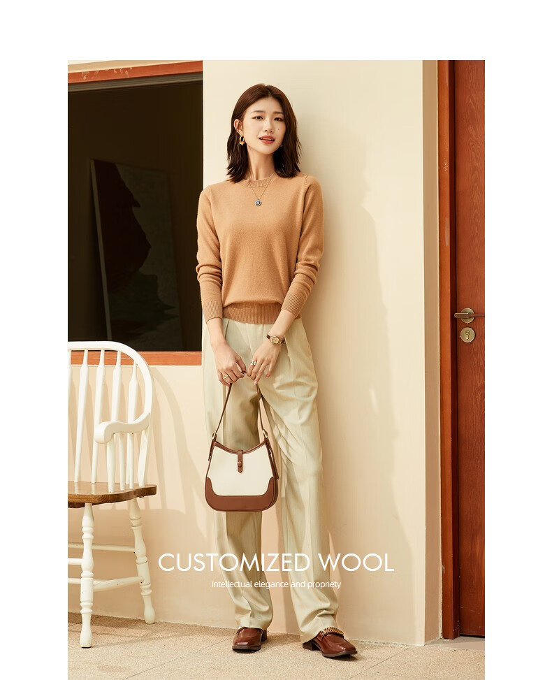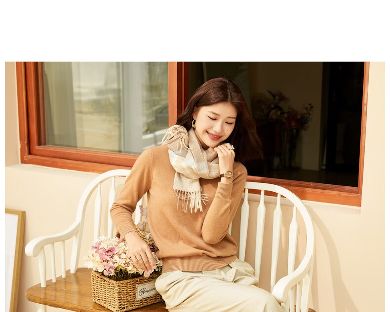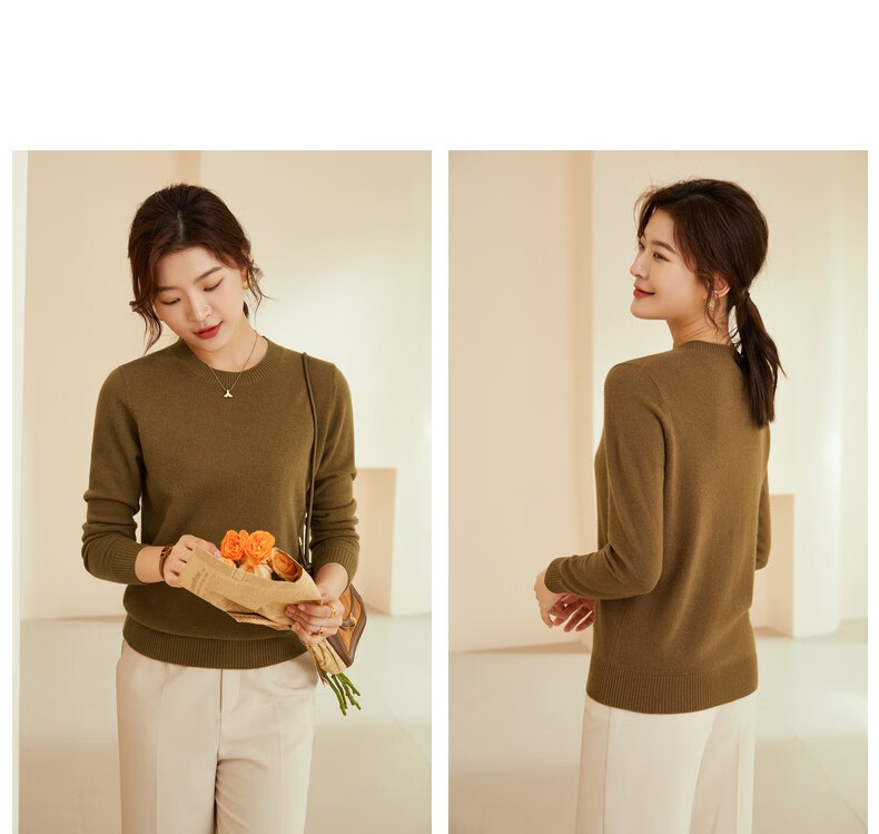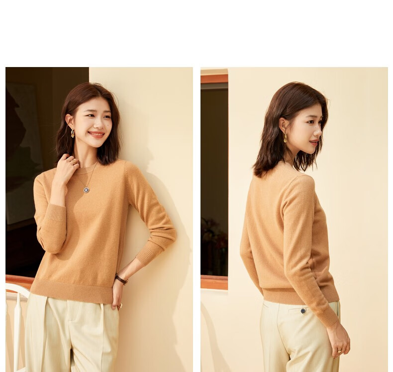 恒源祥圆领纯羊毛衫女秋冬基础打底毛衣纯色时尚套头百搭女装针织衫上衣 小麦色 M /165/88A