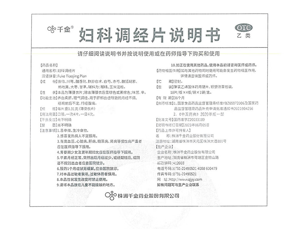 千金妇科调经片0.31g*18片*4板养血柔肝理气调经月经不调经期前后不定行经腹痛