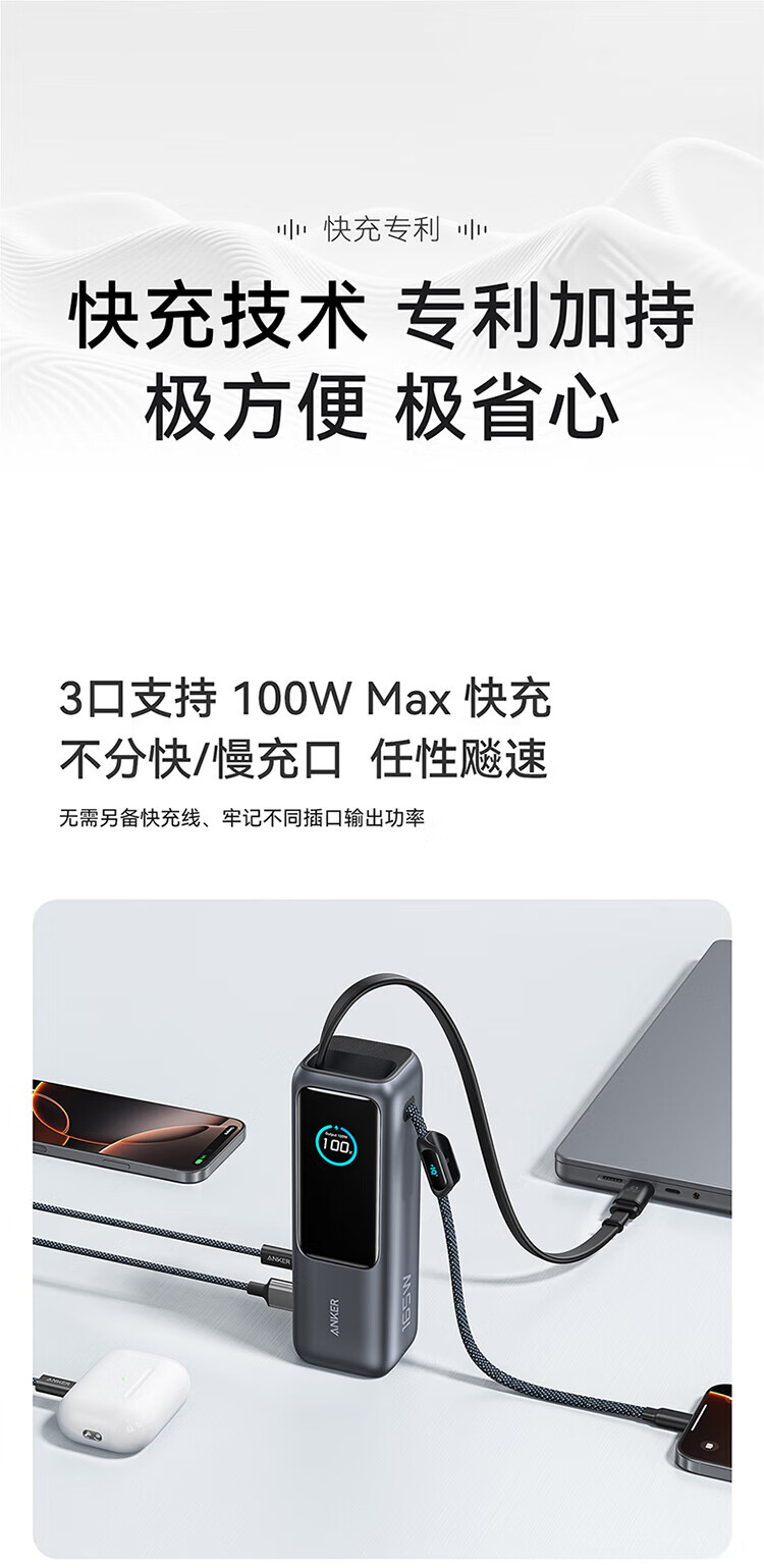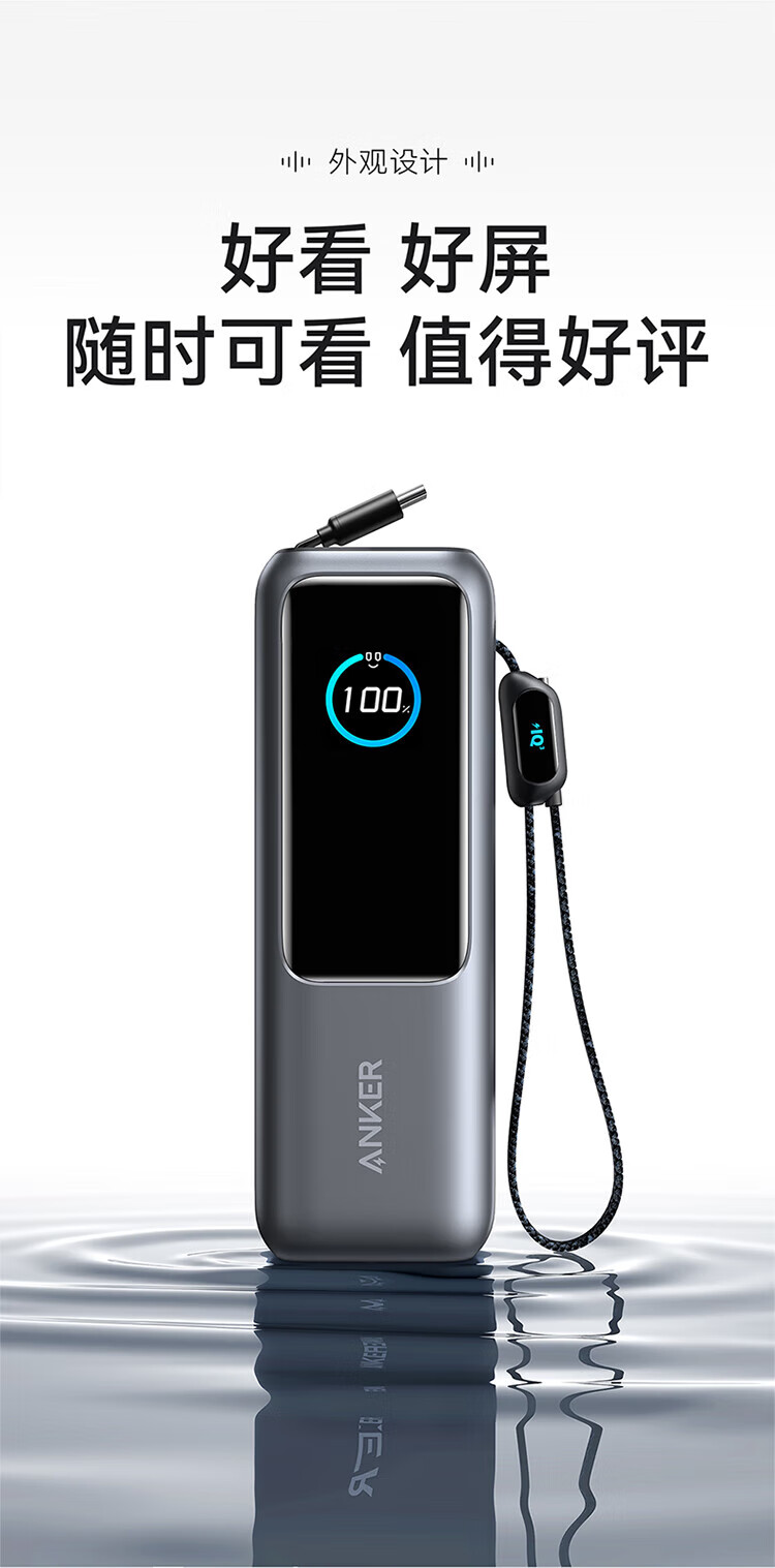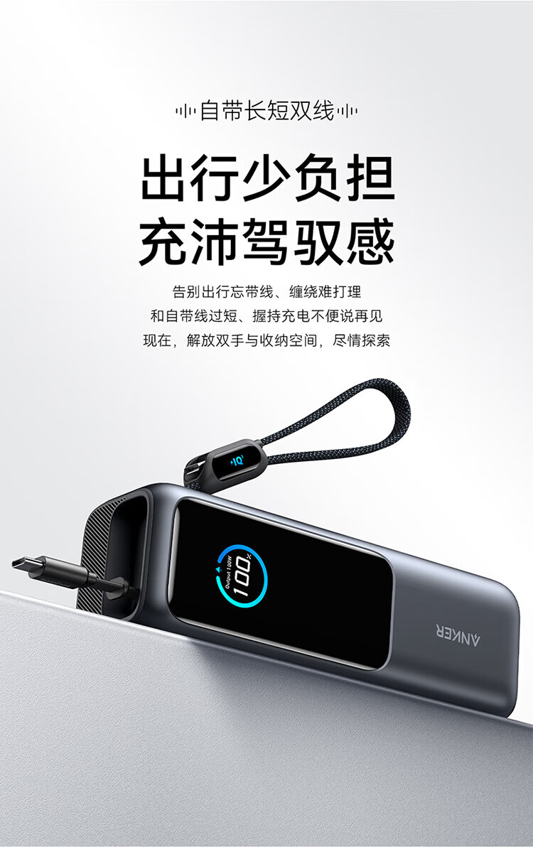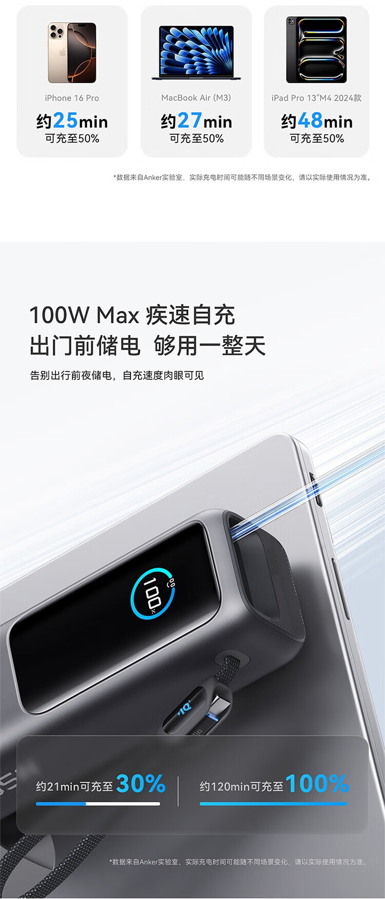 ANKER安克能量舱【新3C认证可上飞机】移动电源25000毫安自带双线伸缩线100W大功率快充 【充电宝锖色】25000mAh|自带双线|智能屏显