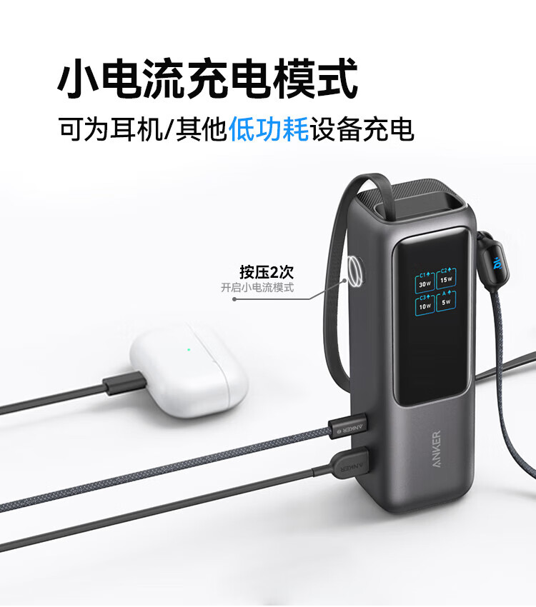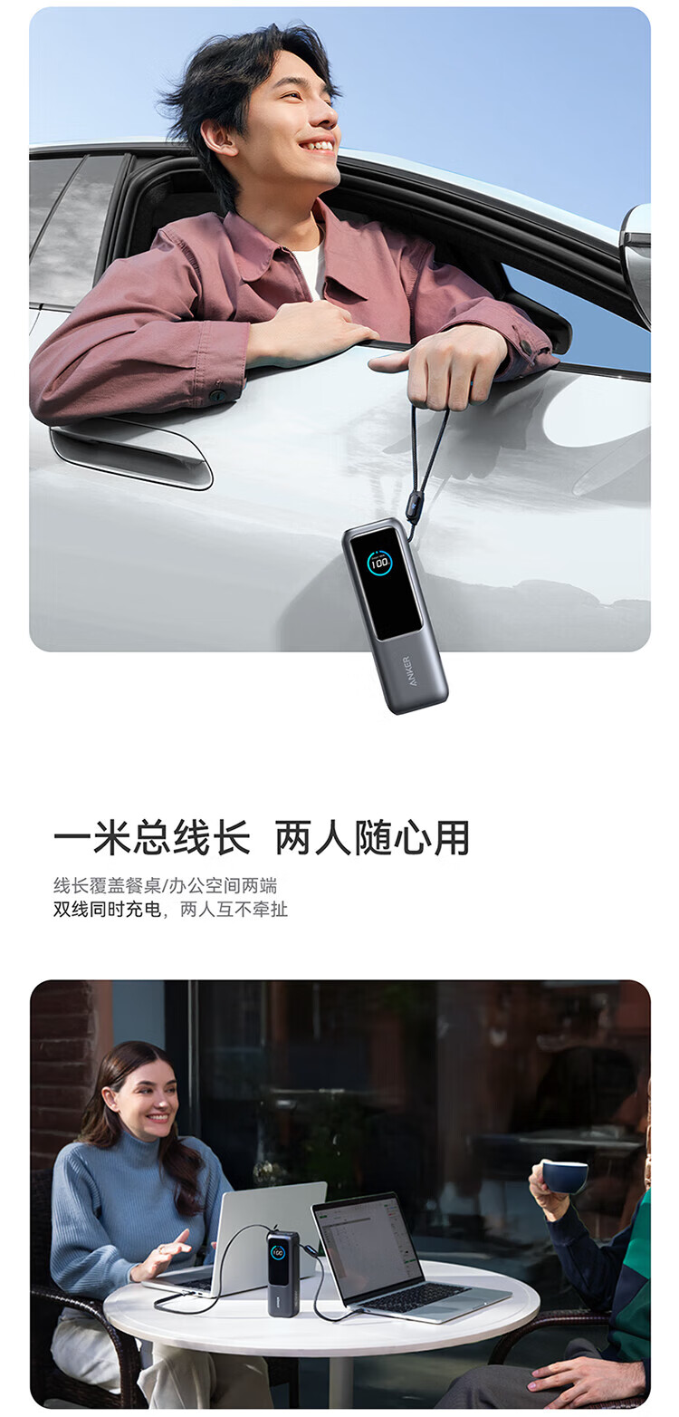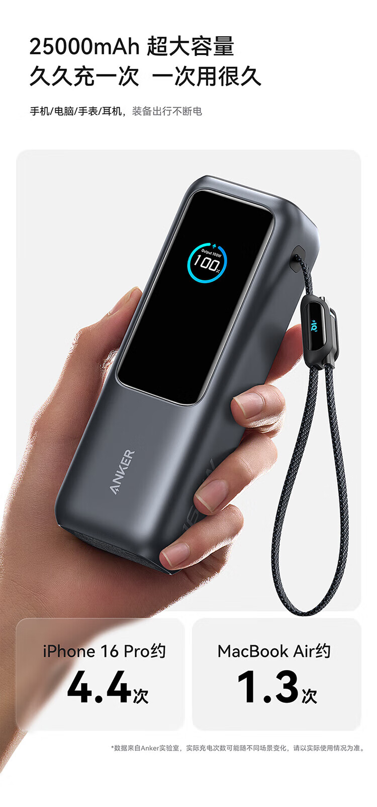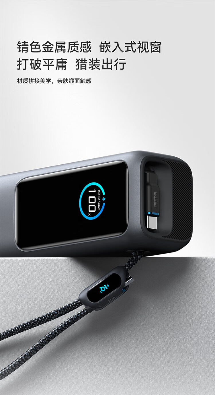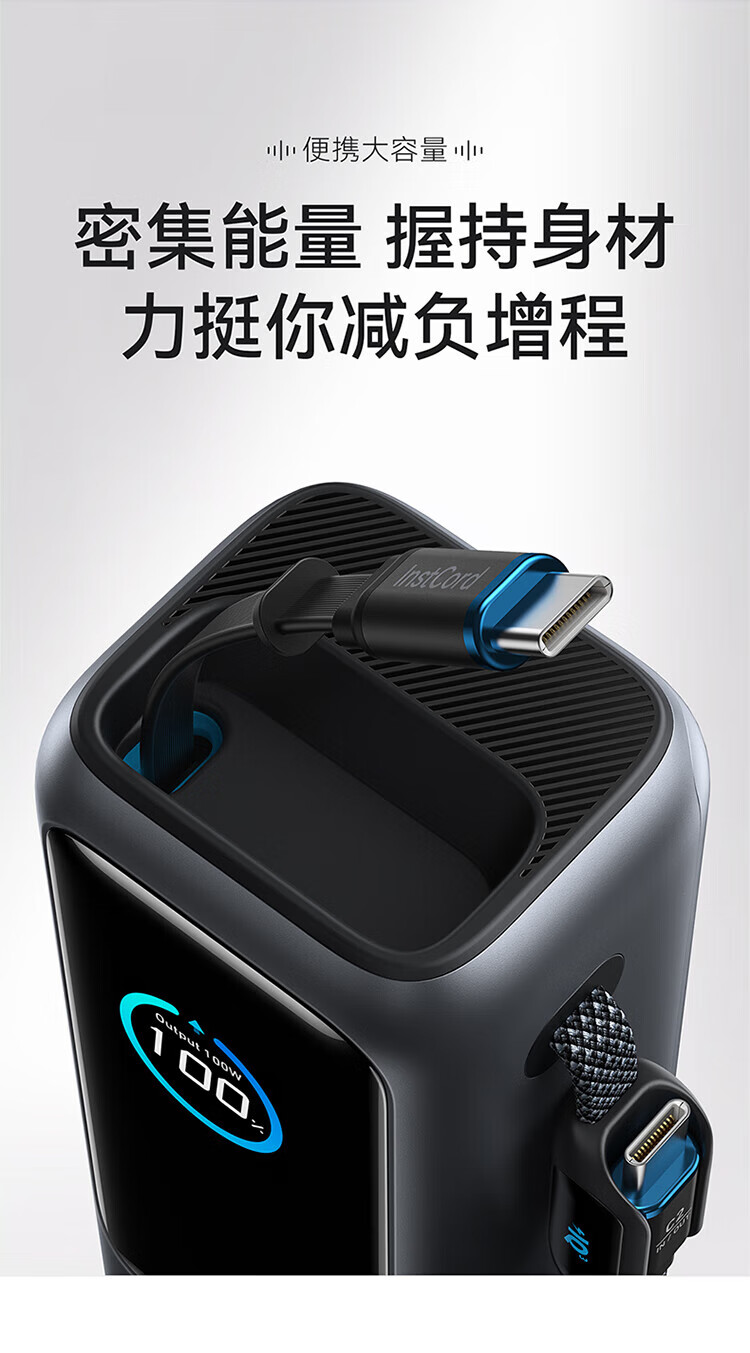ANKER安克能量舱【新3C认证可上飞机】移动电源25000毫安自带双线伸缩线100W大功率快充 【充电宝锖色】25000mAh|自带双线|智能屏显