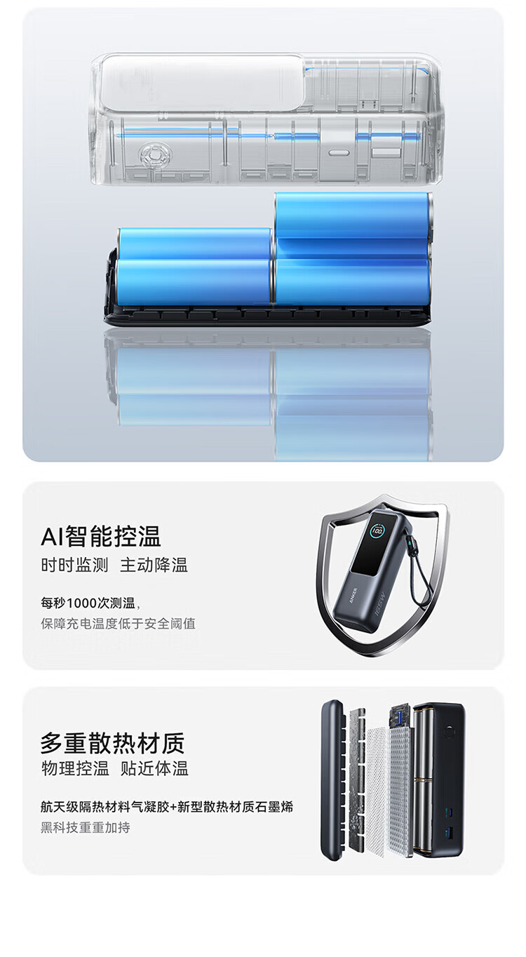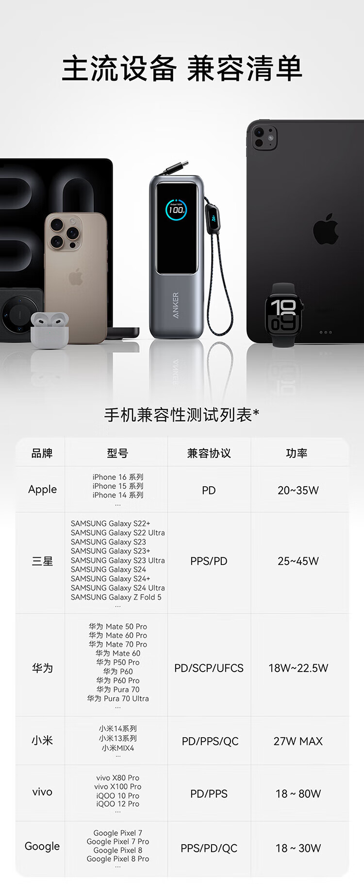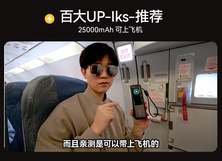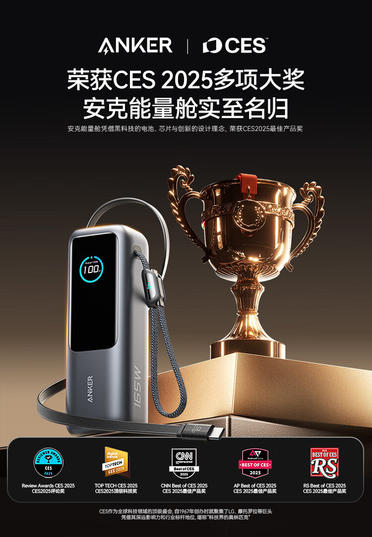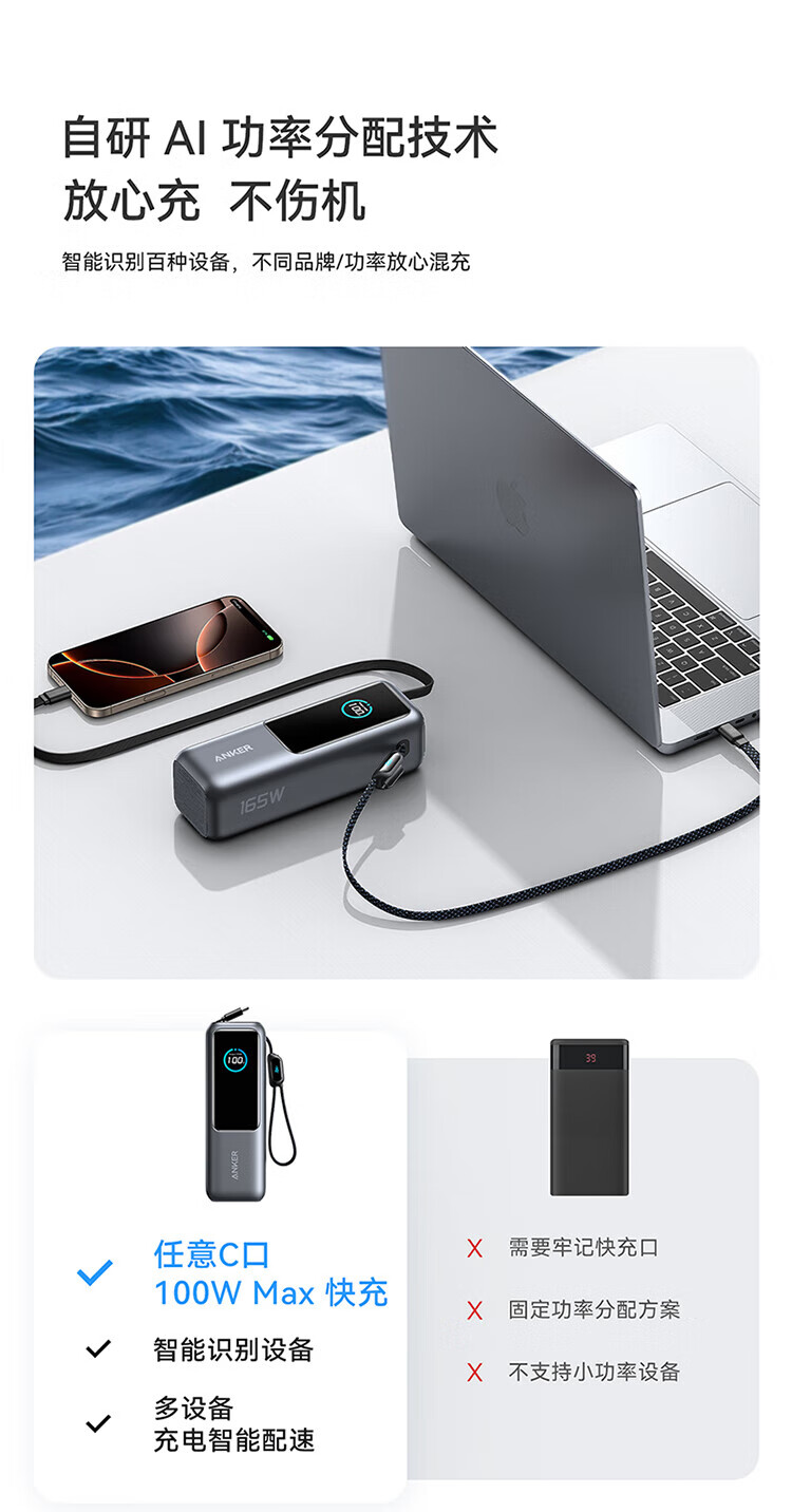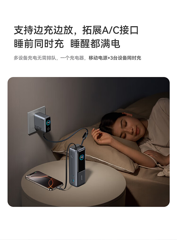 ANKER安克能量舱【新3C认证可上飞机】移动电源25000毫安自带双线伸缩线100W大功率快充 【充电宝锖色】25000mAh|自带双线|智能屏显