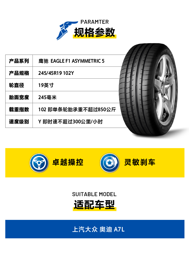 固特异(Goodyear)静音棉轮胎 245/45R19 102Y EAG F1 ASY5 SCT鹰驰5代 原配奥迪A7L