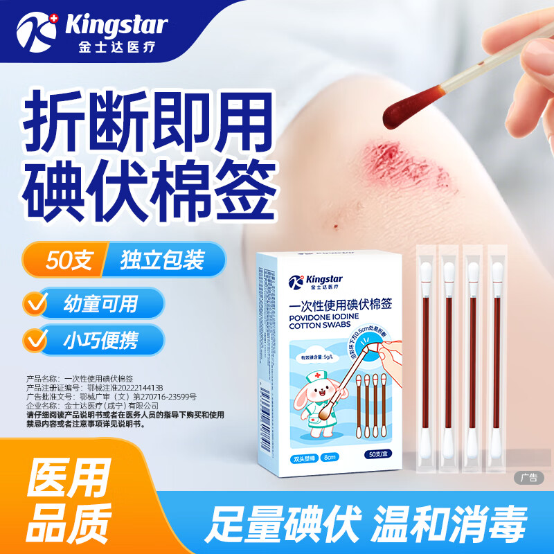 金士达tk碘伏棉签医用一次性消毒棉签新生婴儿脐带消毒独立便携无菌 【独立装】 碘伏棉签2盒共100支
