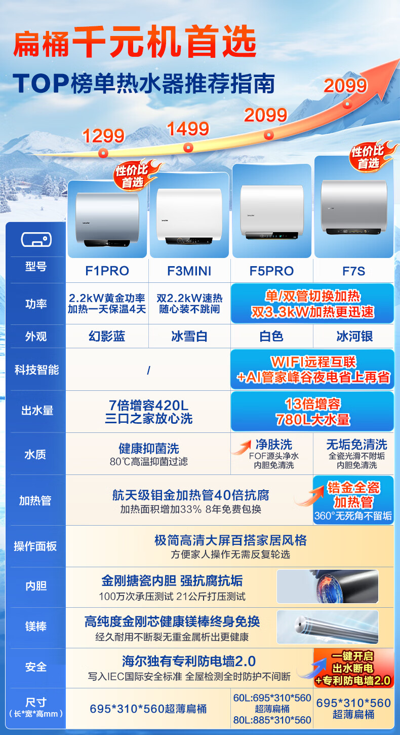 海尔(Haier)智家出品Leader统帅懒人热水器电热水器阻垢净水洗F7S扁桶双胆出水断电60升一级能效内胆免清洗 60L 3300W 25年新品阻垢净水洗F7S