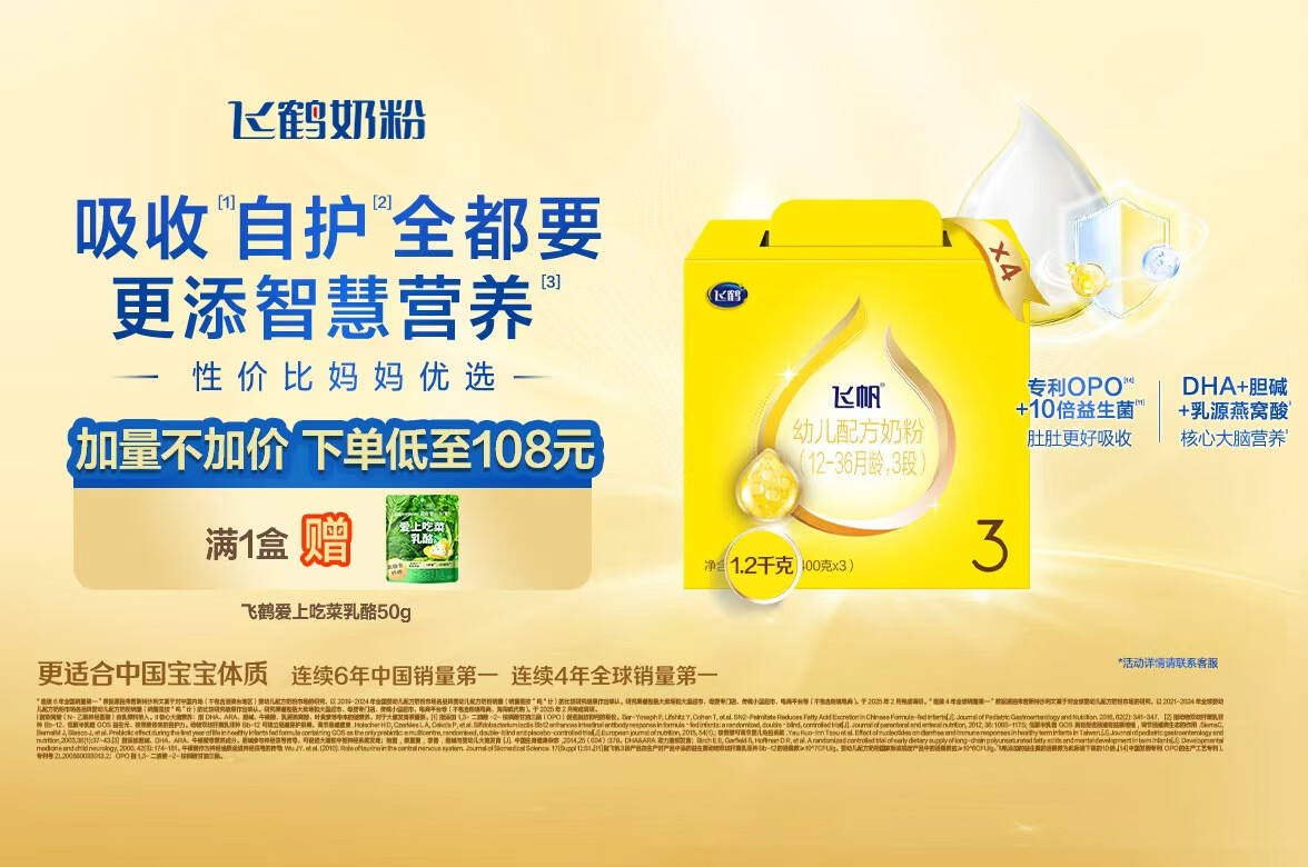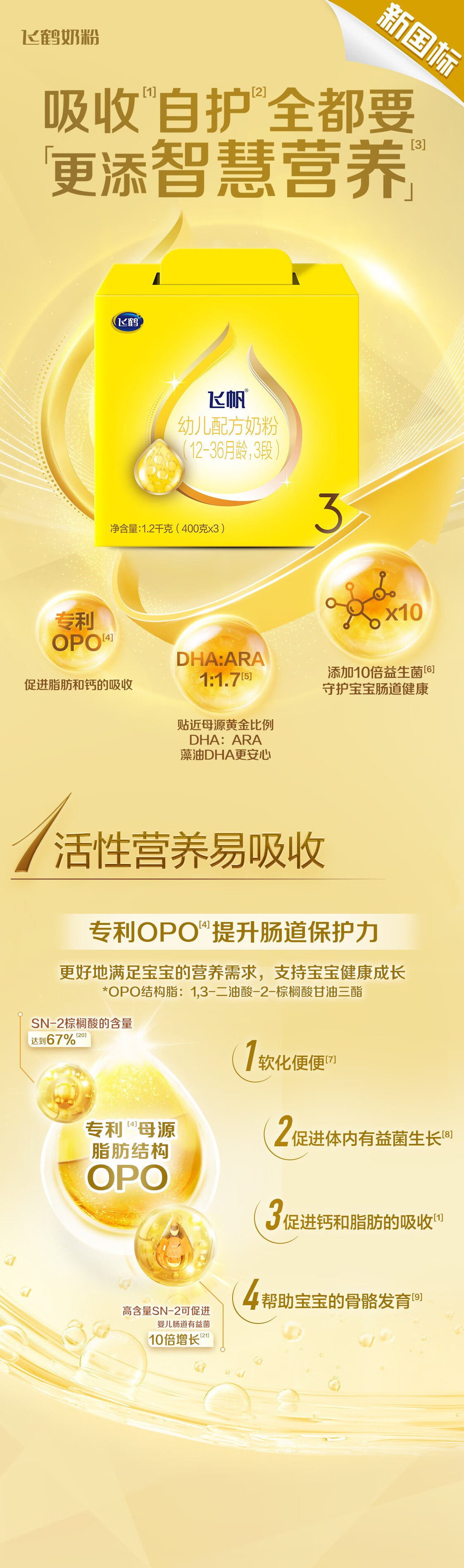 飞鹤飞帆OPO促吸收幼儿配方奶粉3段(12-36月龄)1200g*4 DHA好脑力