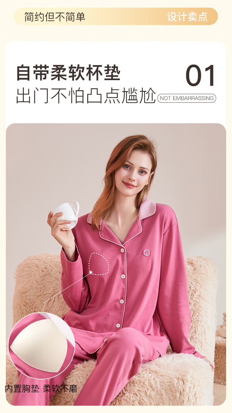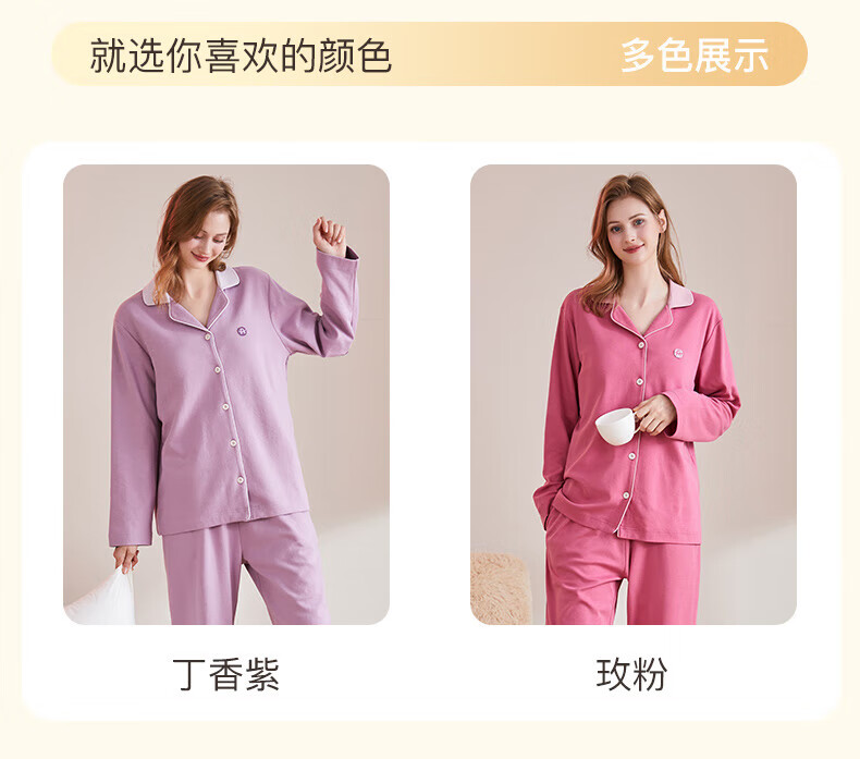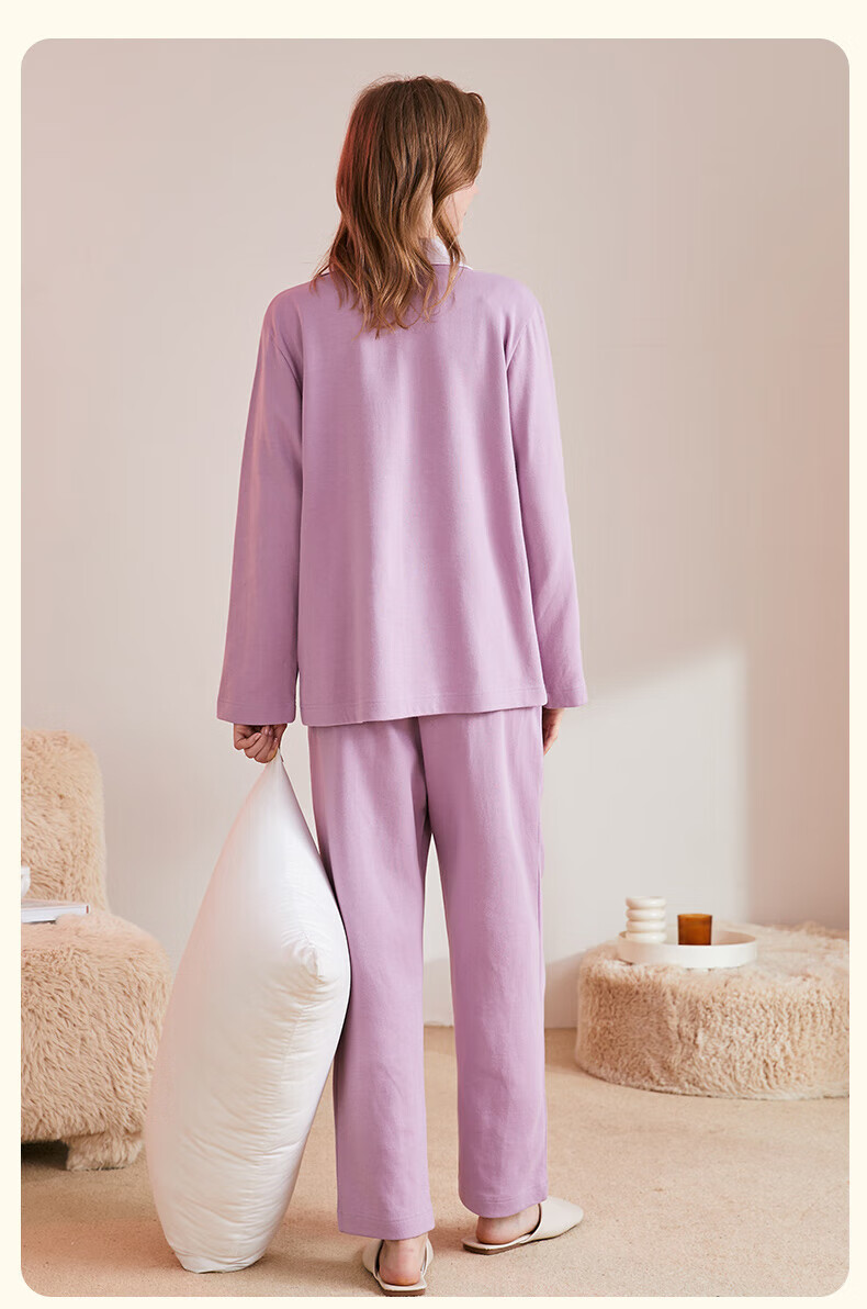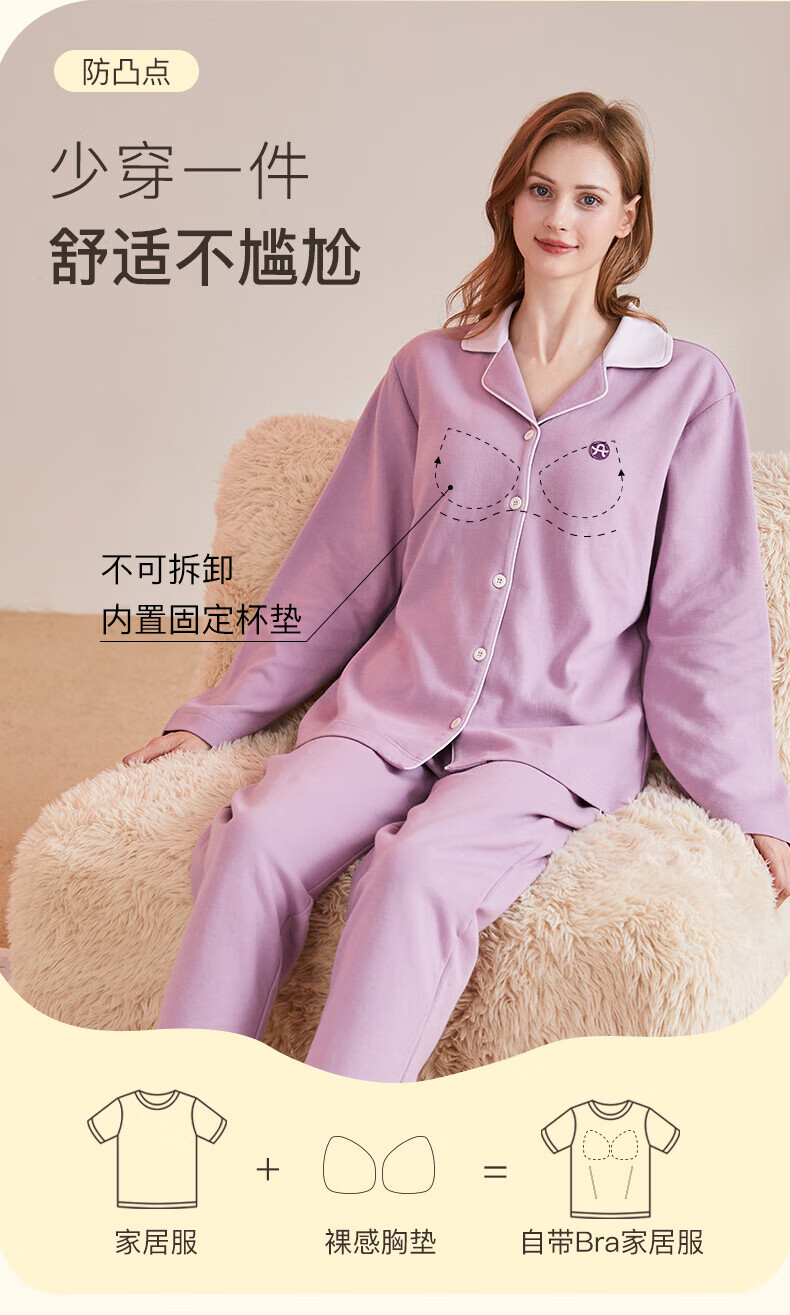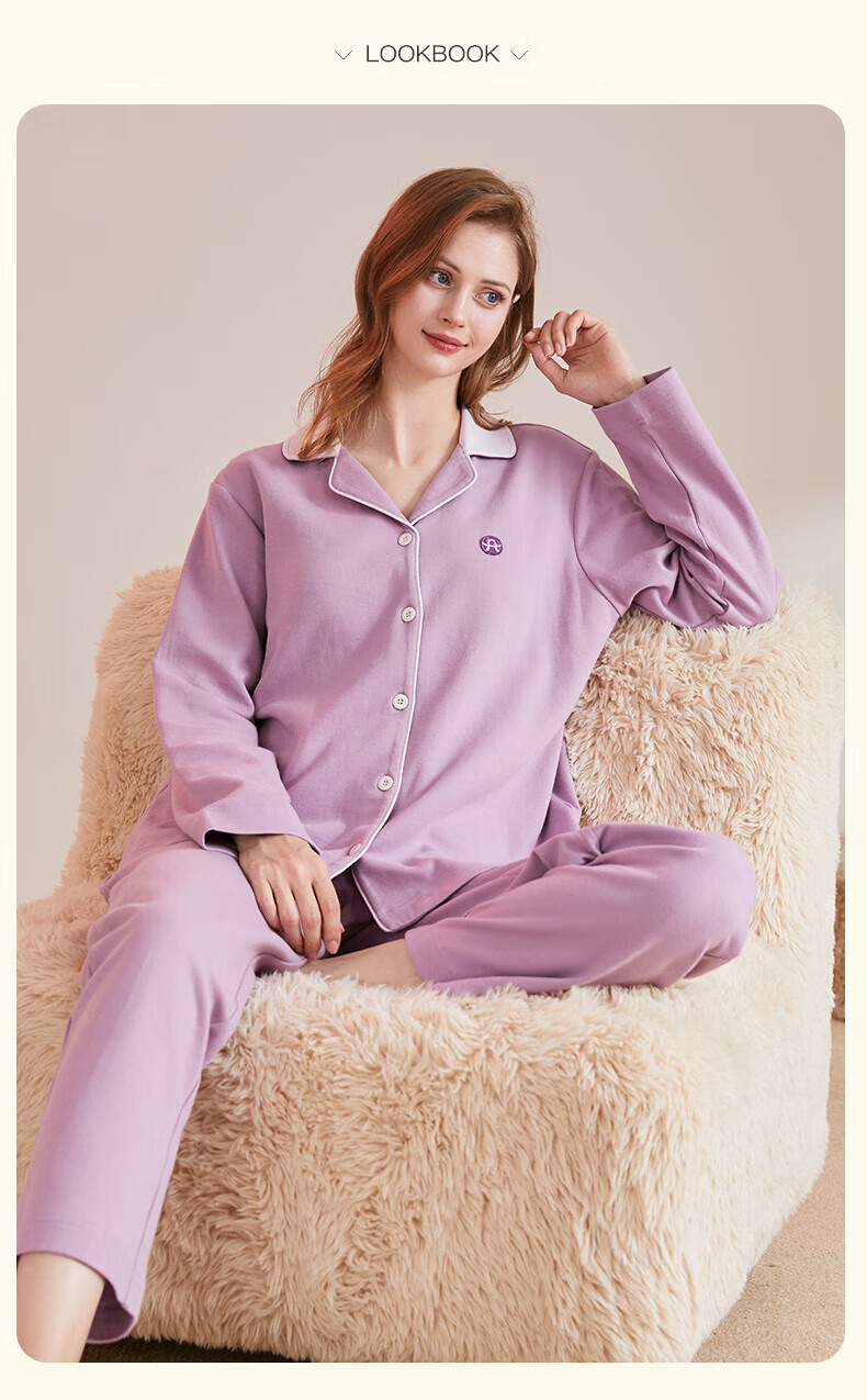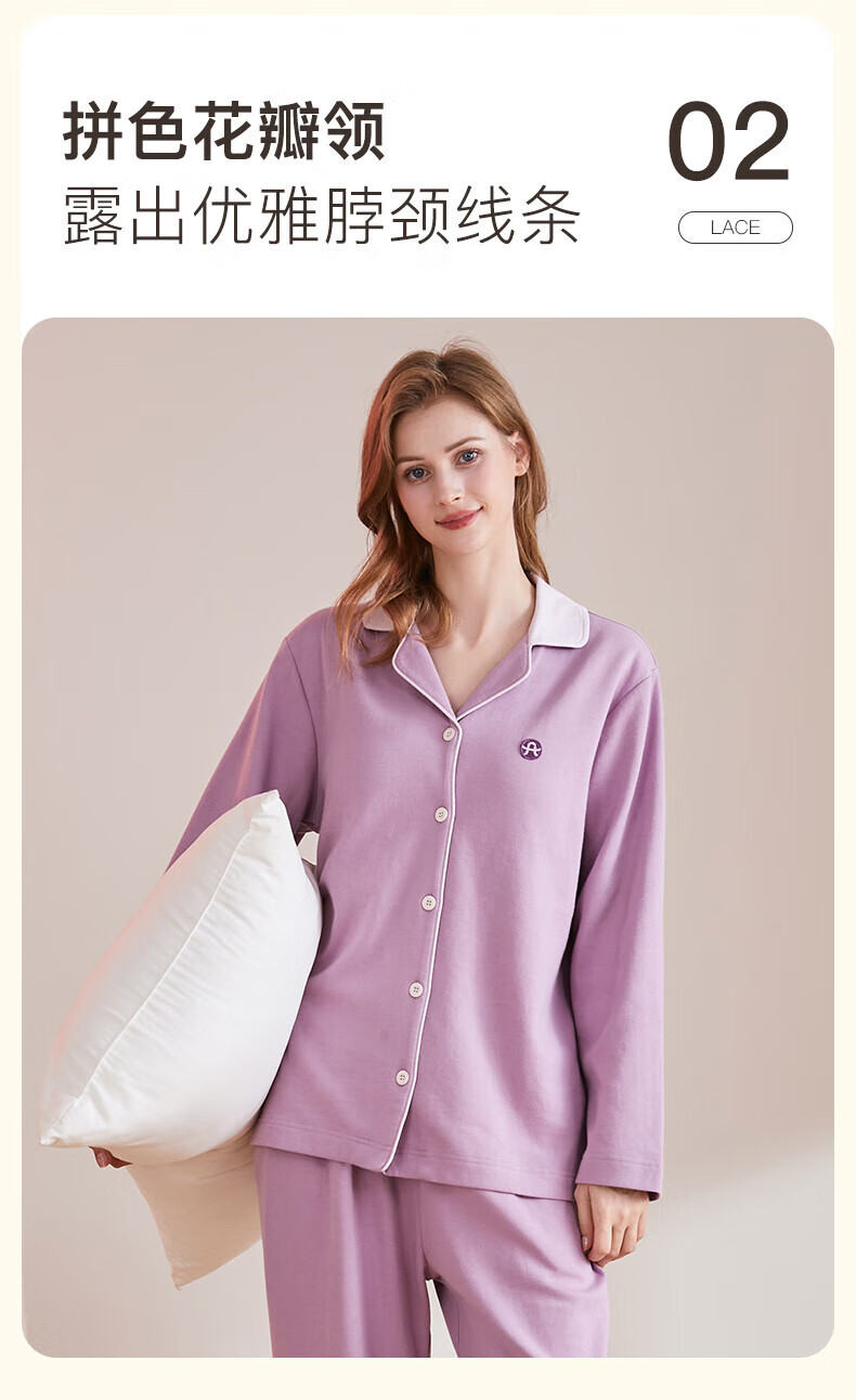 芬腾睡衣女【5A带罩杯】早秋拼色全棉翻领纯色纽扣家居服套装 丁香紫 L