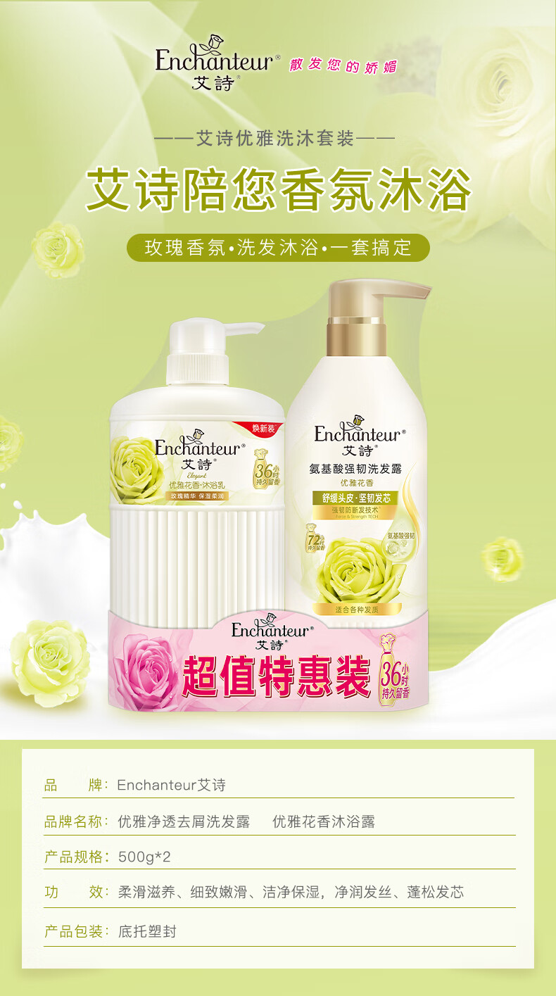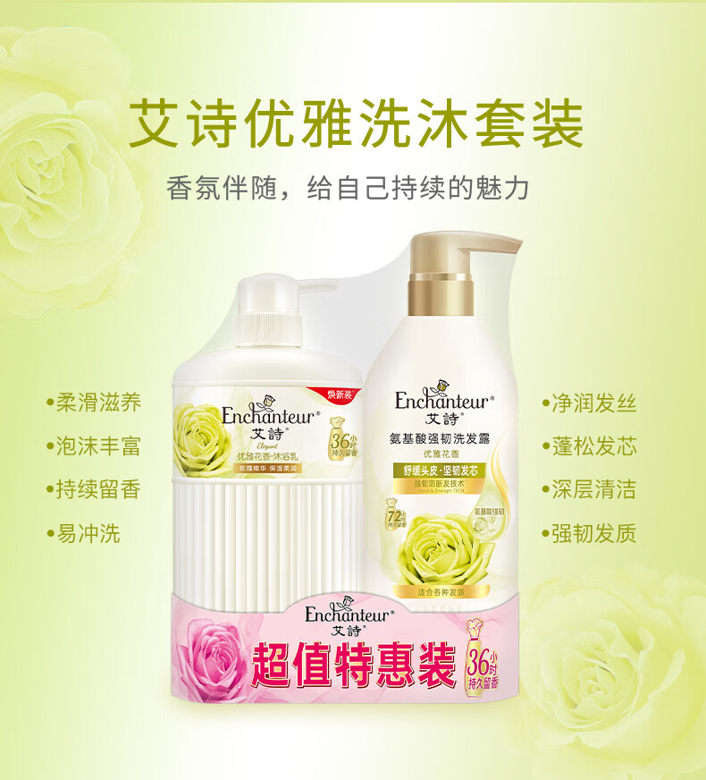 艾诗(Enchanteur)洗沐套装香味持久控油蓬松洗发水+优雅茉莉花香氛沐浴露