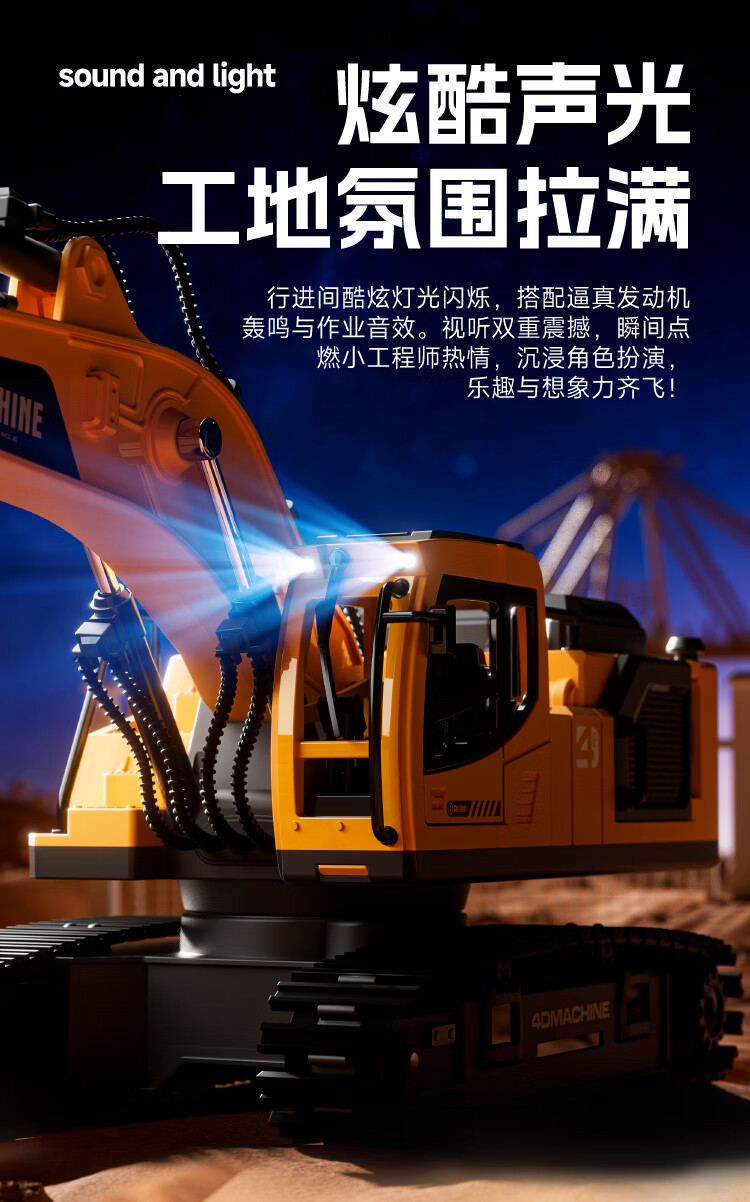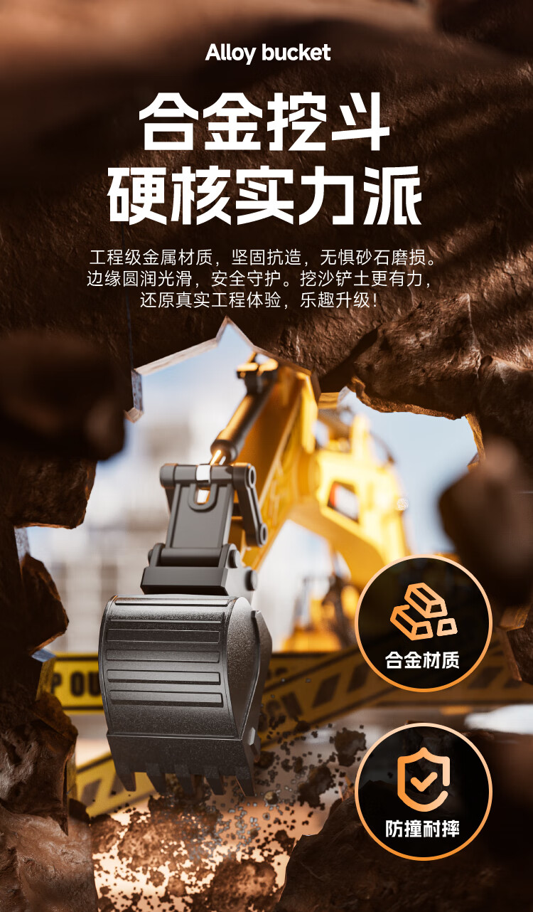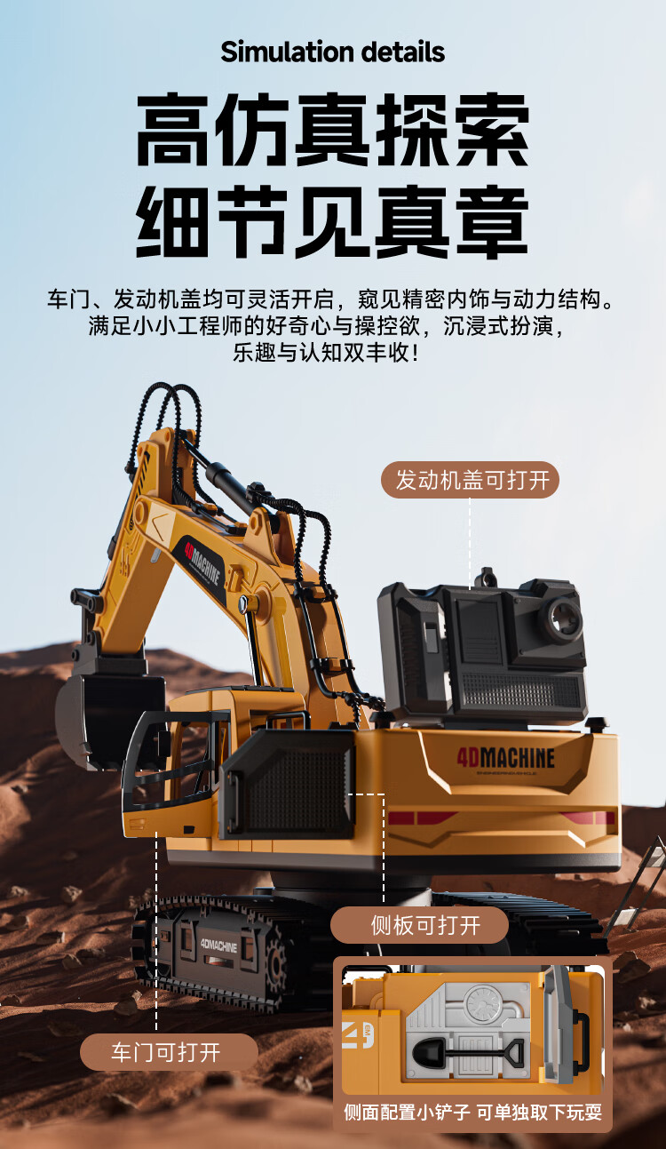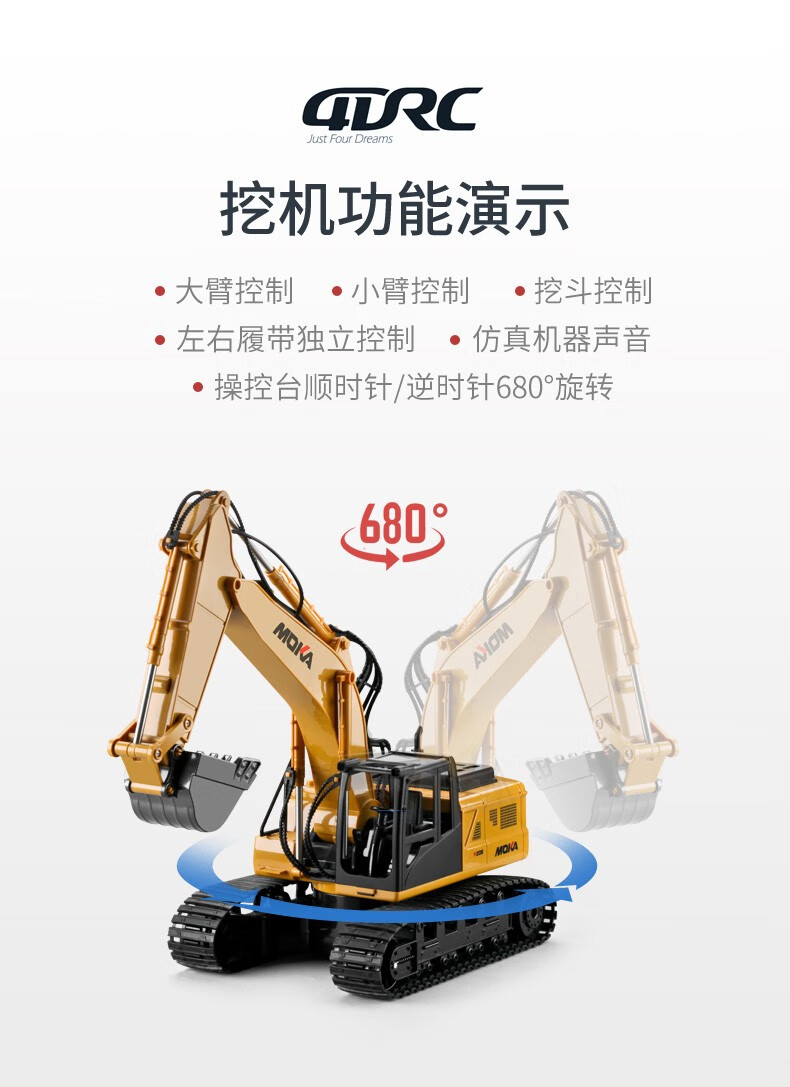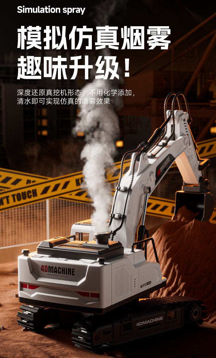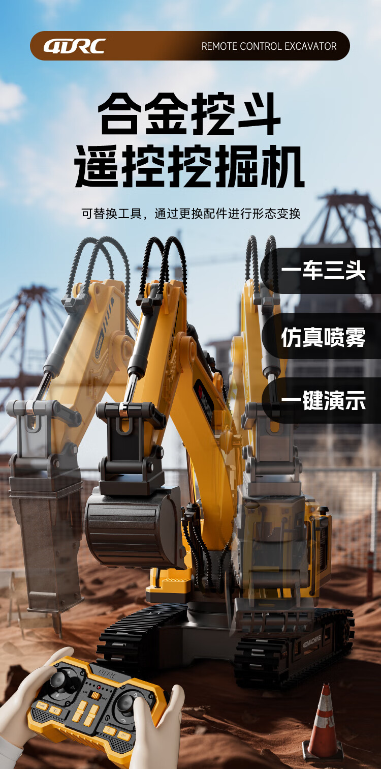 4DRC合金挖掘机遥控汽车挖土工程卡车模型儿童3-6岁玩具男孩生日礼物 【12通+喷雾+合金挖斗】黄色双电