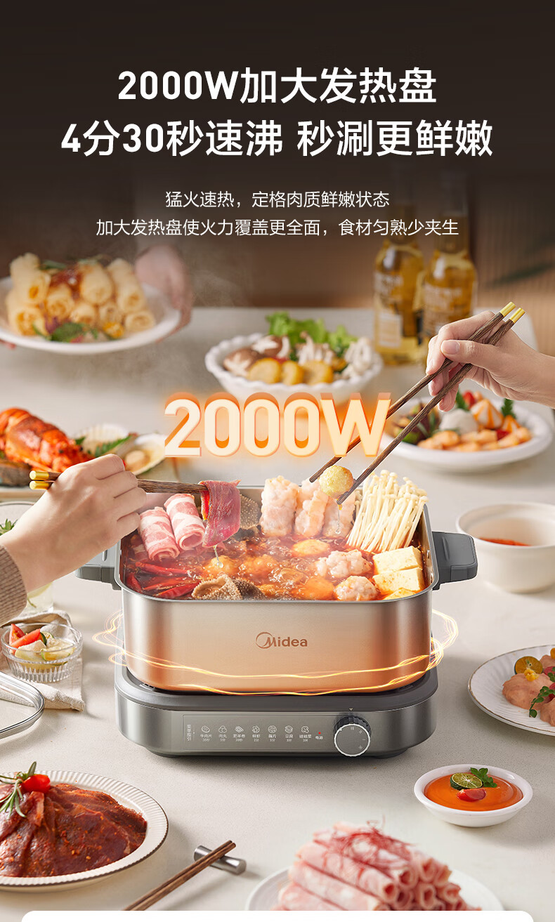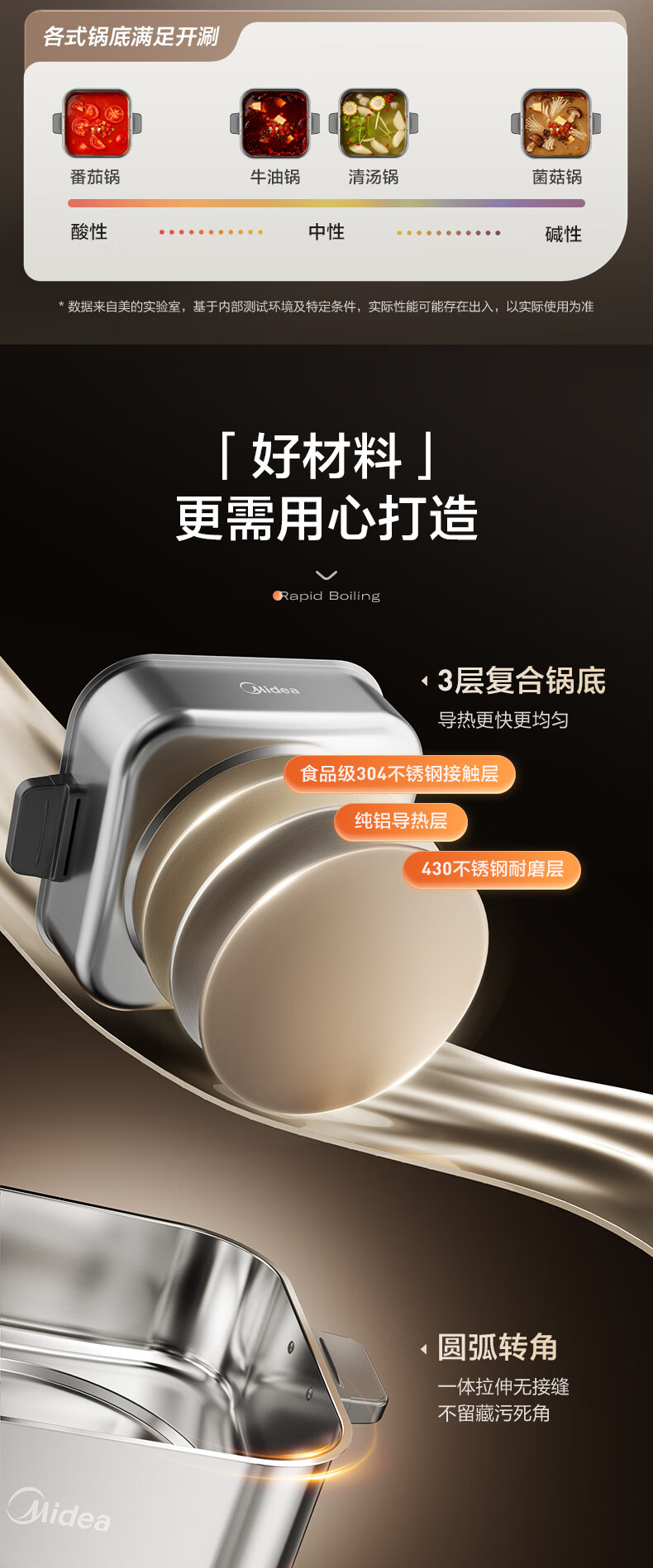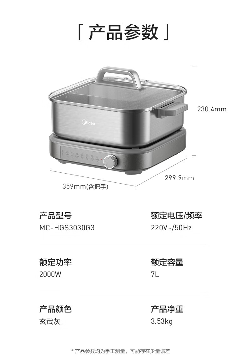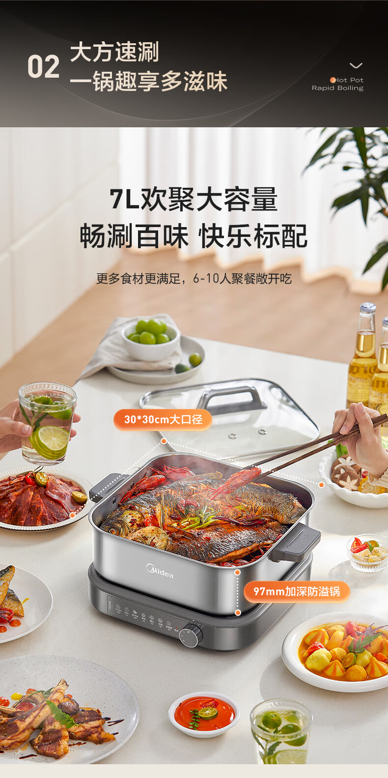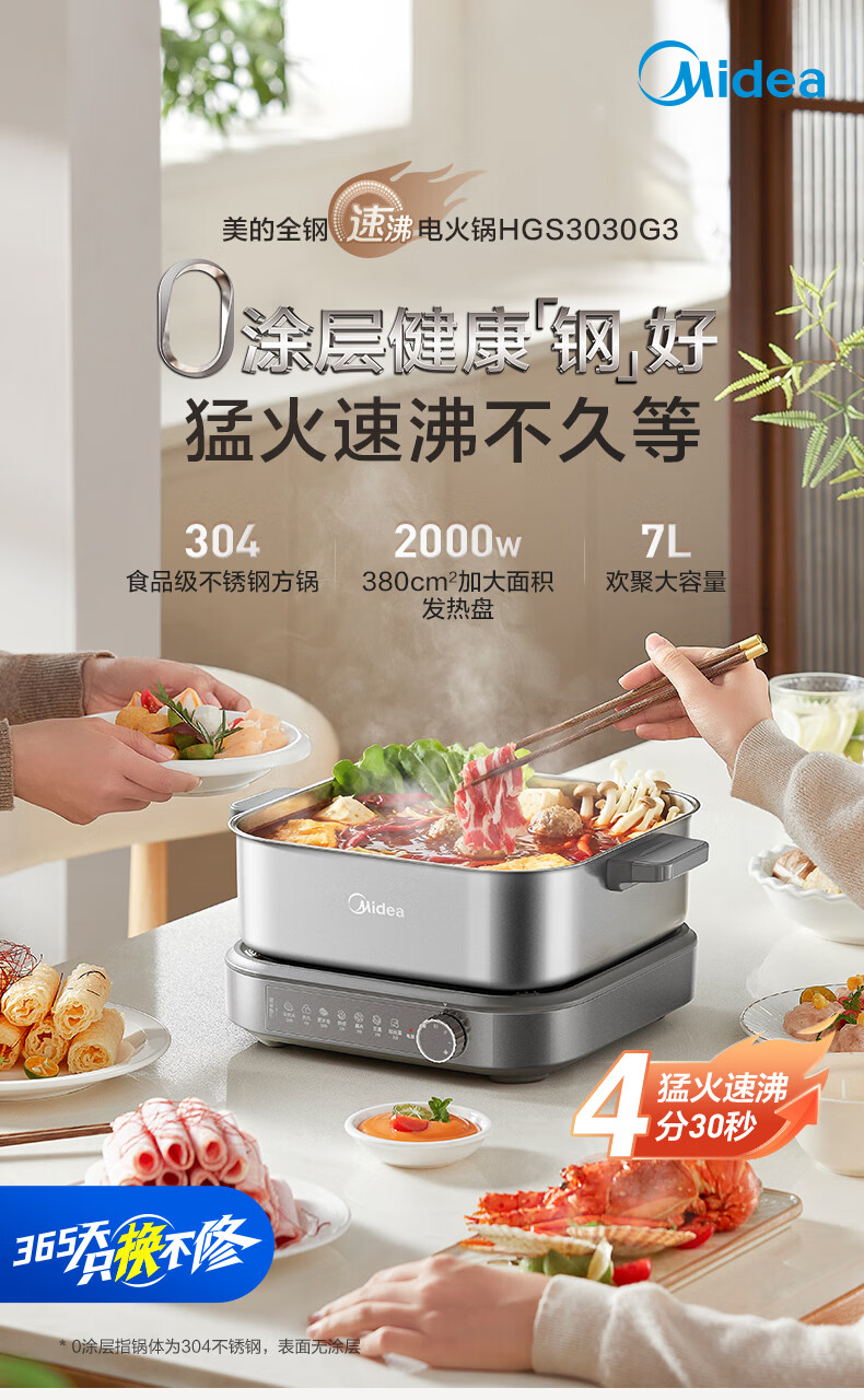 美的(Midea)全钢速沸电火锅0涂层家用5-8人7L超薄火锅专用锅304不锈钢无涂层电煮锅涮炖煮多功能料理锅 7L MC-HGS3030G3 全钢0涂层丨4分钟速沸 304不锈钢内胆