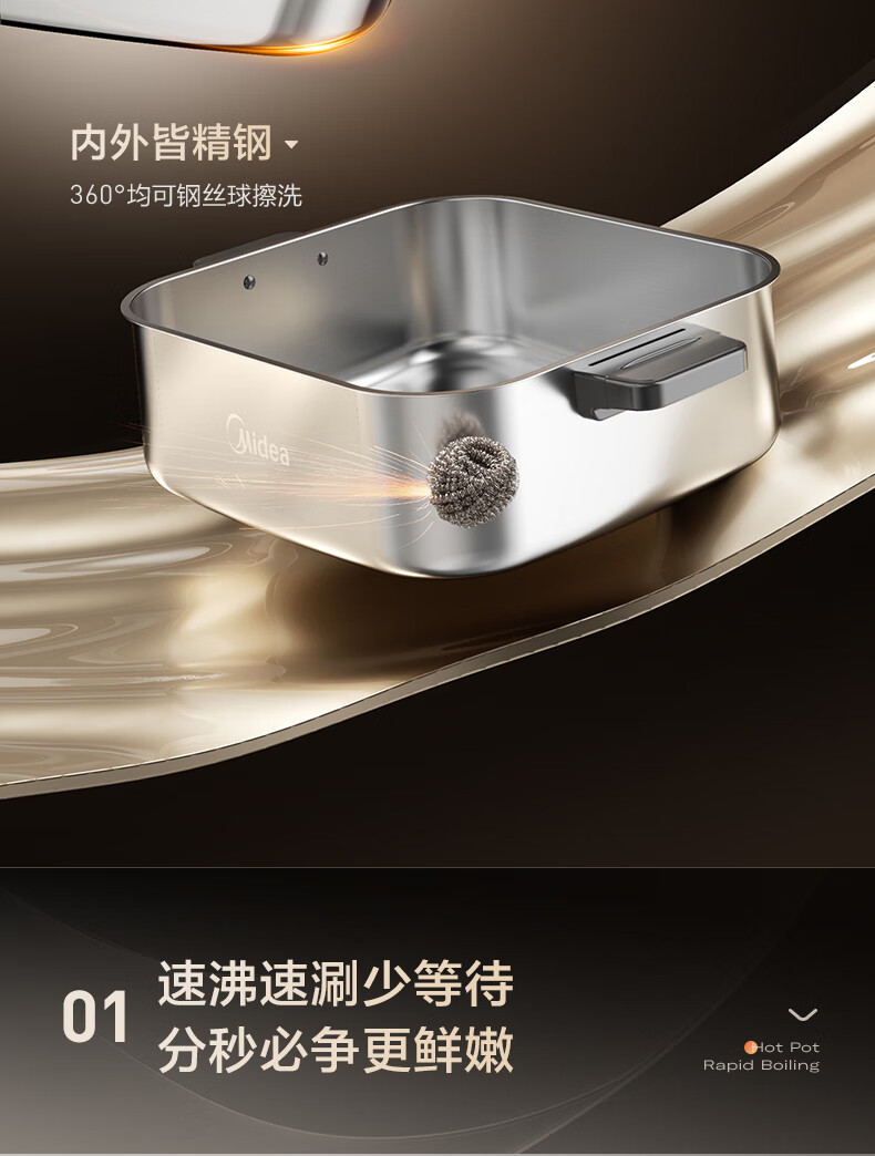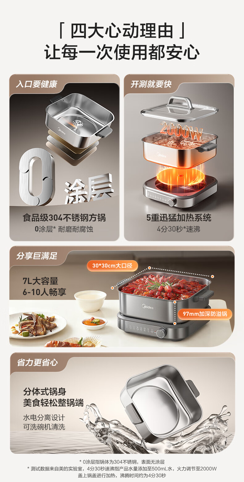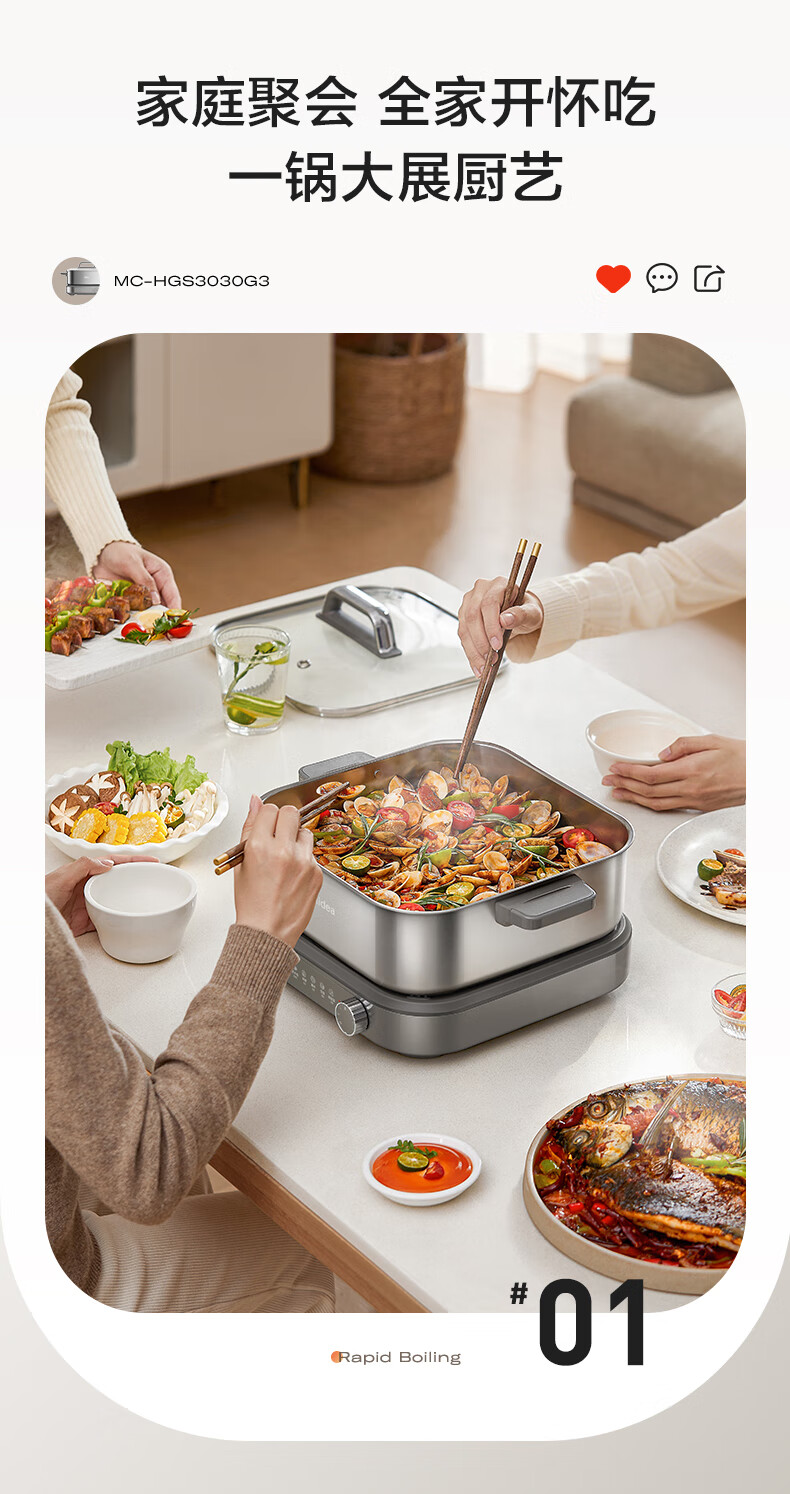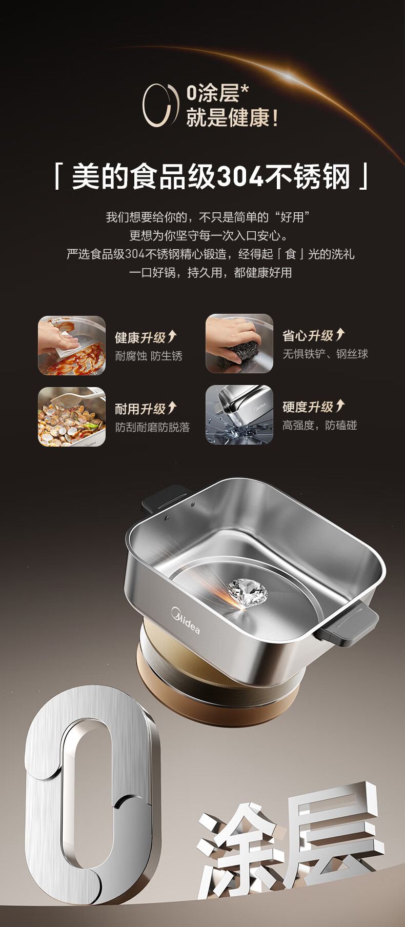 美的(Midea)全钢速沸电火锅0涂层家用5-8人7L超薄火锅专用锅304不锈钢无涂层电煮锅涮炖煮多功能料理锅 7L MC-HGS3030G3 全钢0涂层丨4分钟速沸 304不锈钢内胆