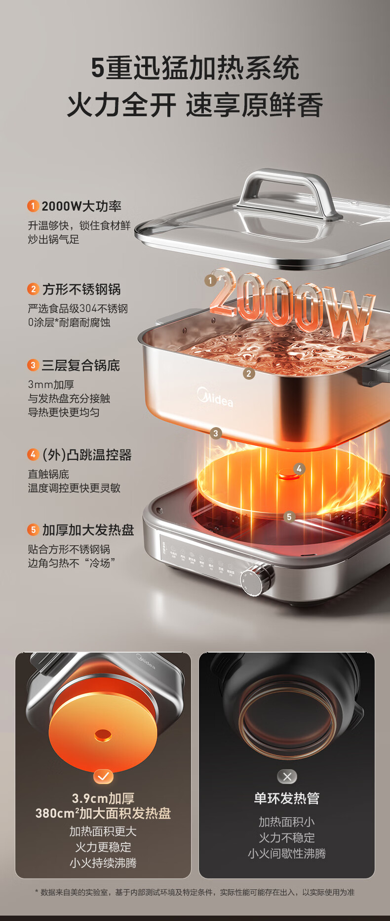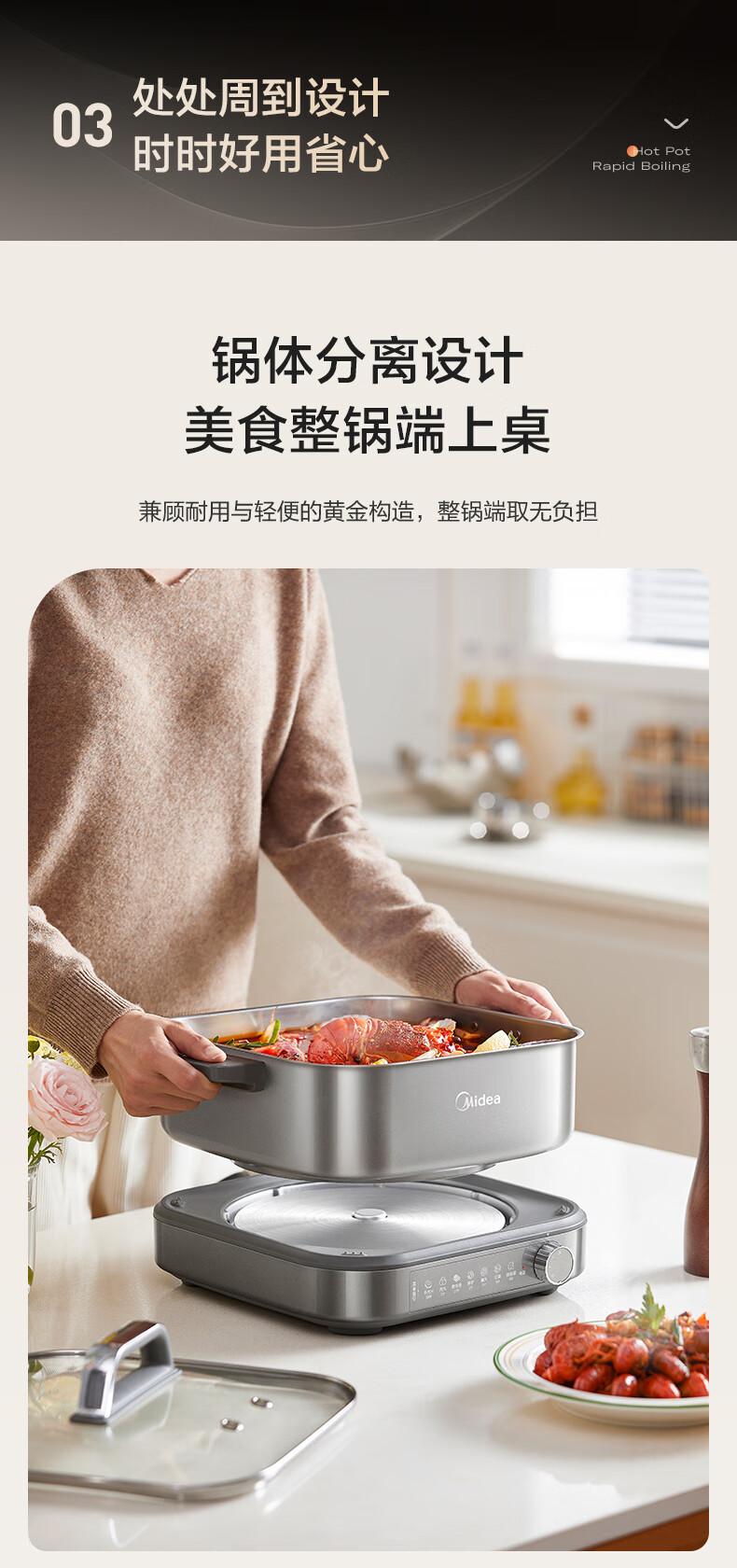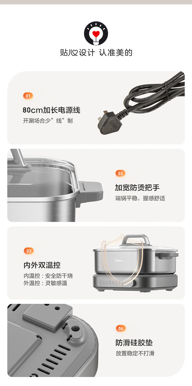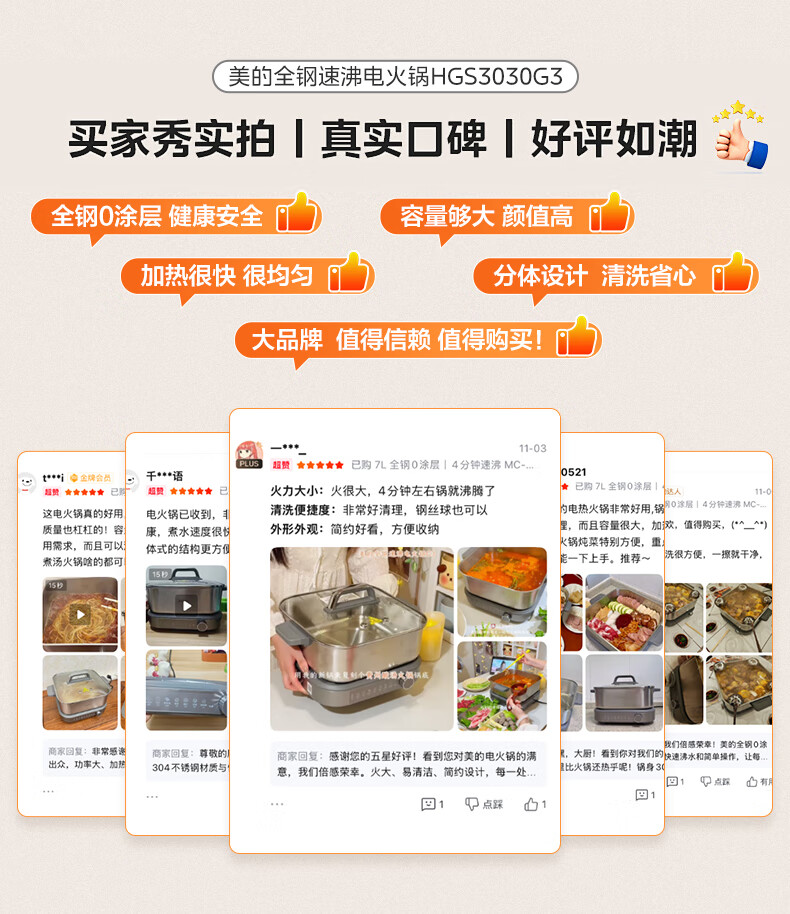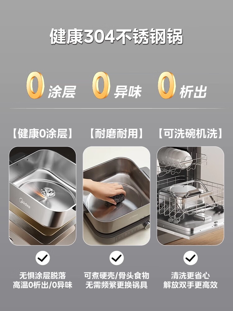 美的(Midea)全钢速沸电火锅0涂层家用5-8人7L超薄火锅专用锅304不锈钢无涂层电煮锅涮炖煮多功能料理锅 7L MC-HGS3030G3 全钢0涂层丨4分钟速沸 304不锈钢内胆