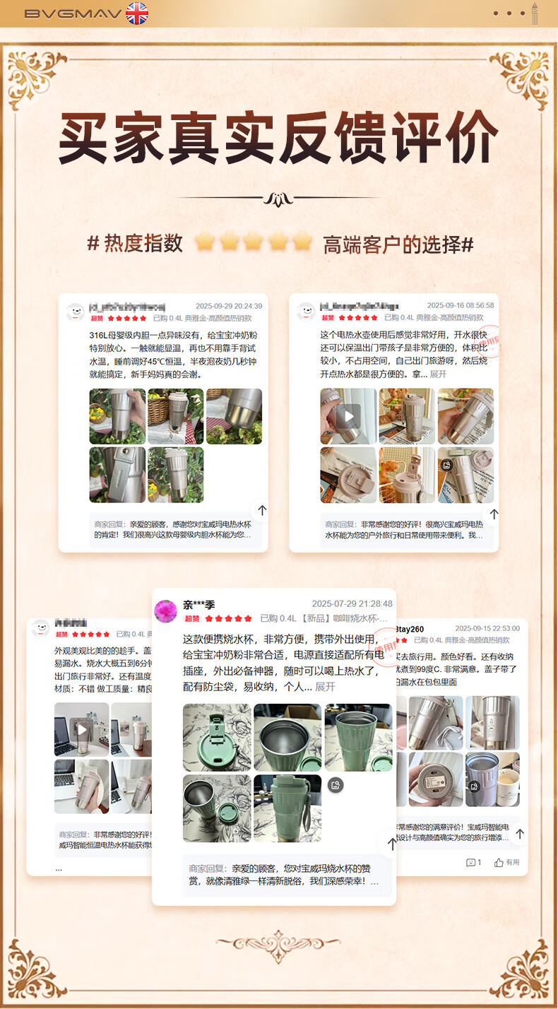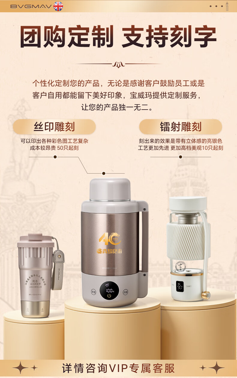 宝威玛(BVGMAV)英国户外旅行便携智能恒温电热水杯316不锈钢内胆双层密封防漏水咖啡杯保温杯 0.4L 典雅金-宽幅电压