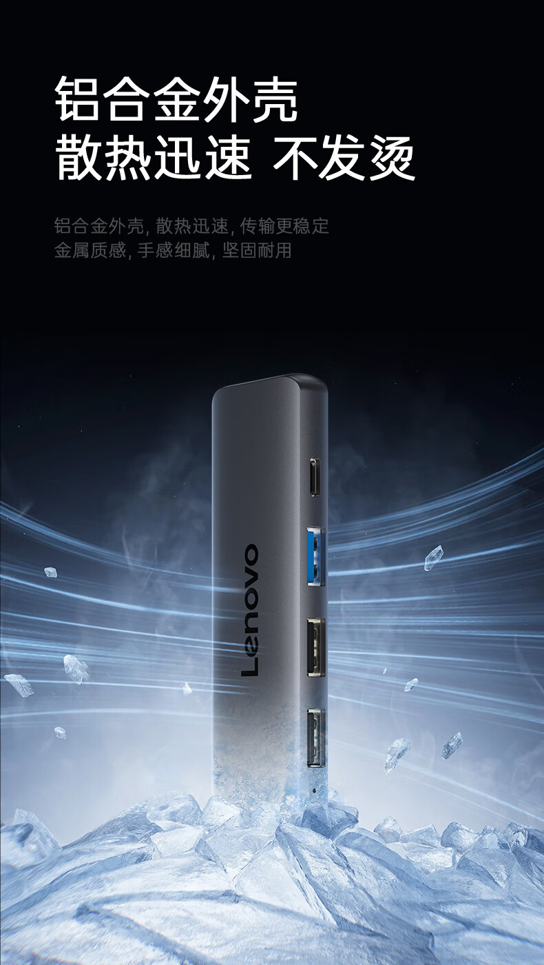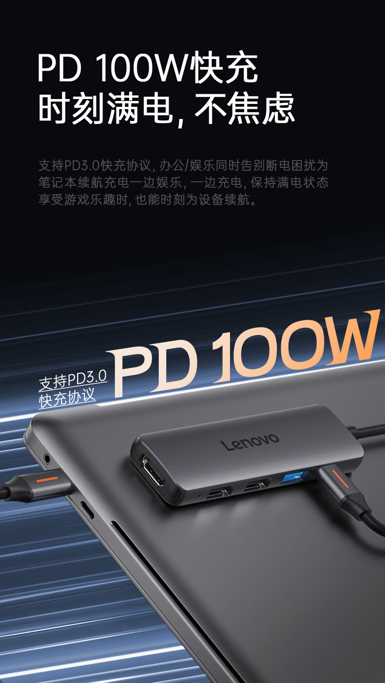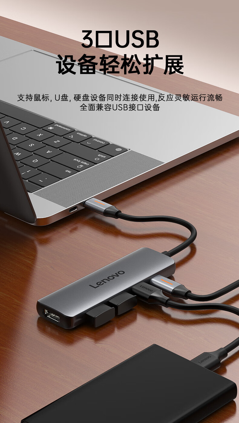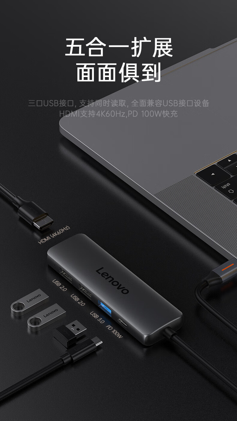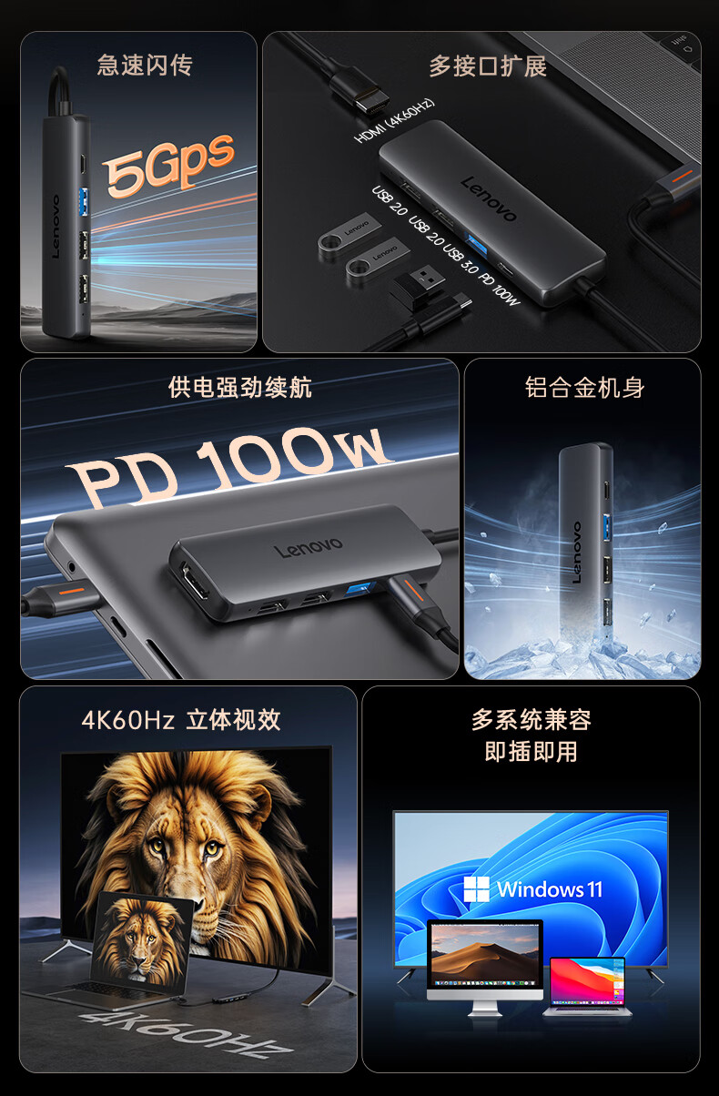 联想(Lenovo)Type-C扩展坞USB分线器转换HDMI转接拓展坞4K60Hz投屏扩展PD快充适用苹果手机平板小新笔记本电脑