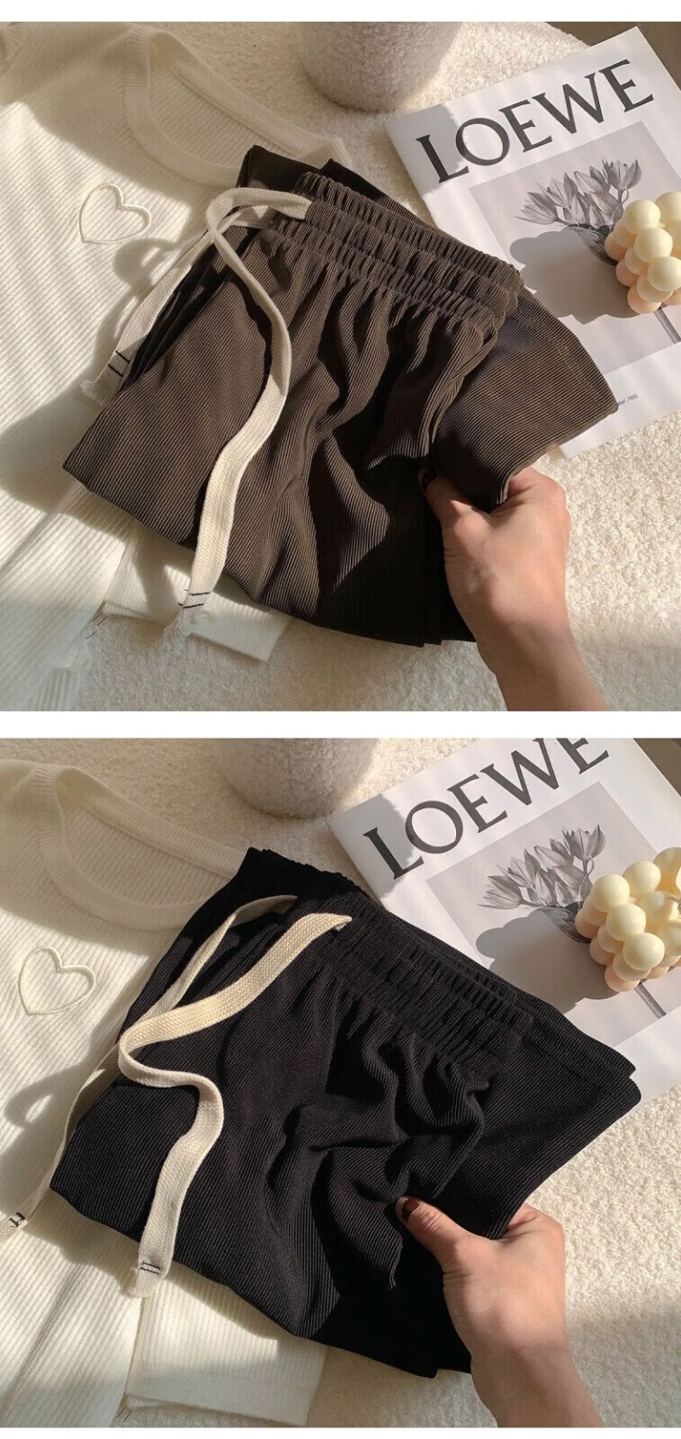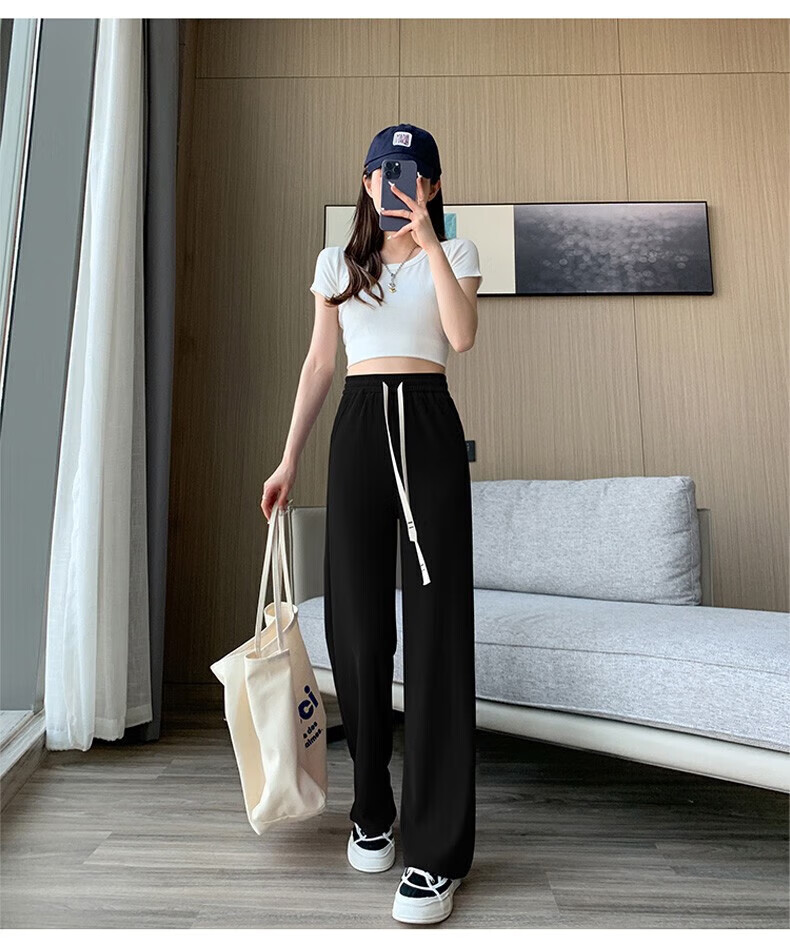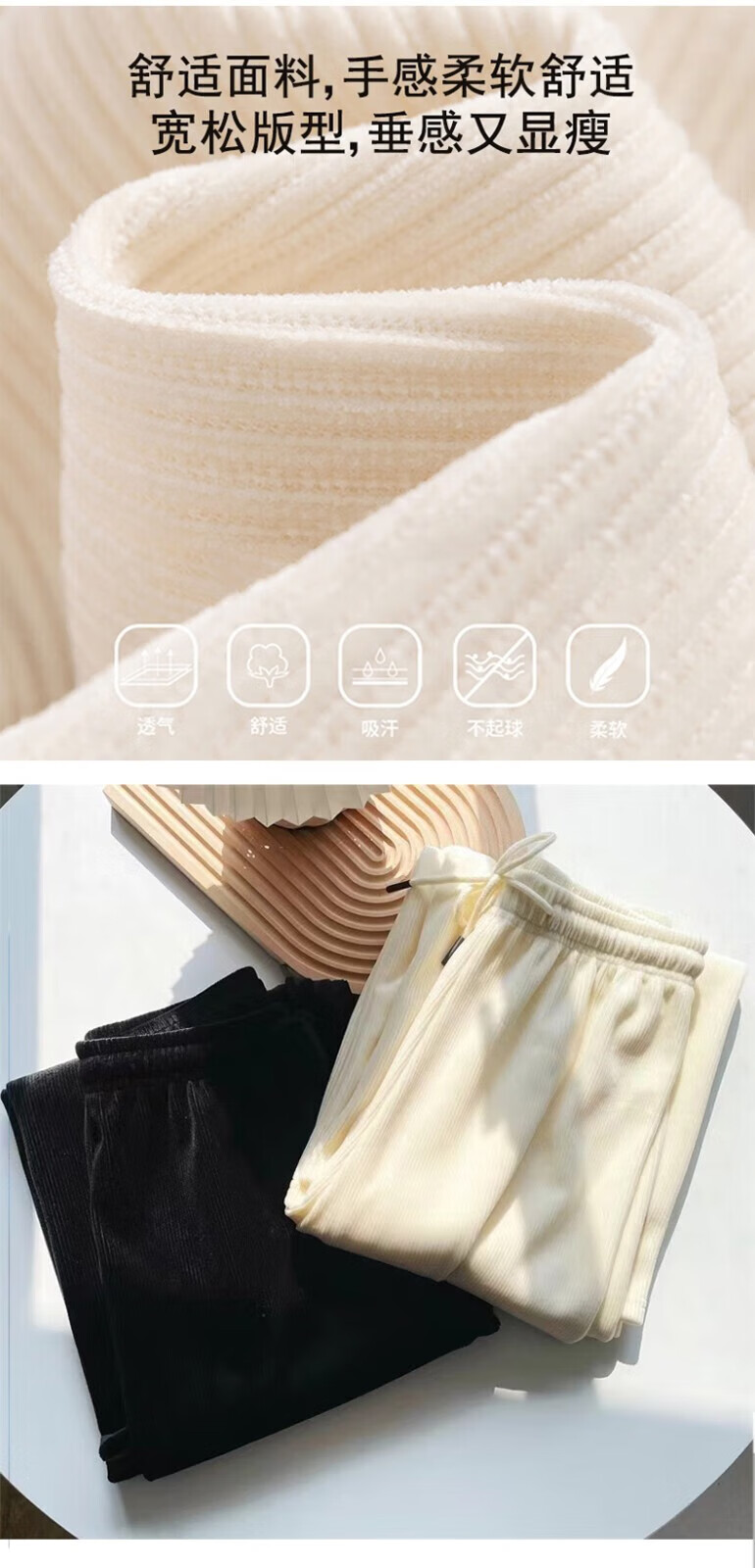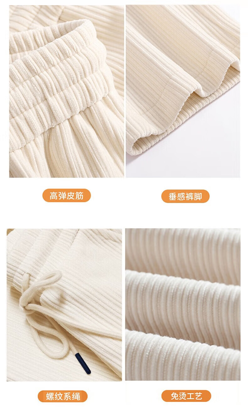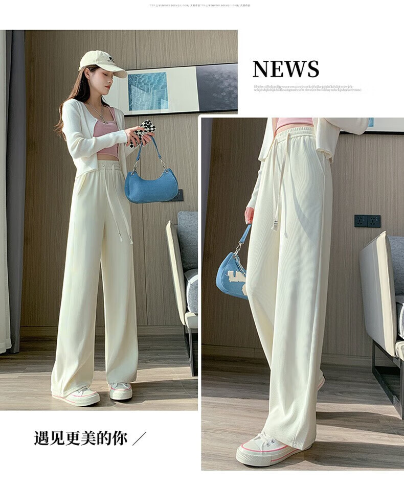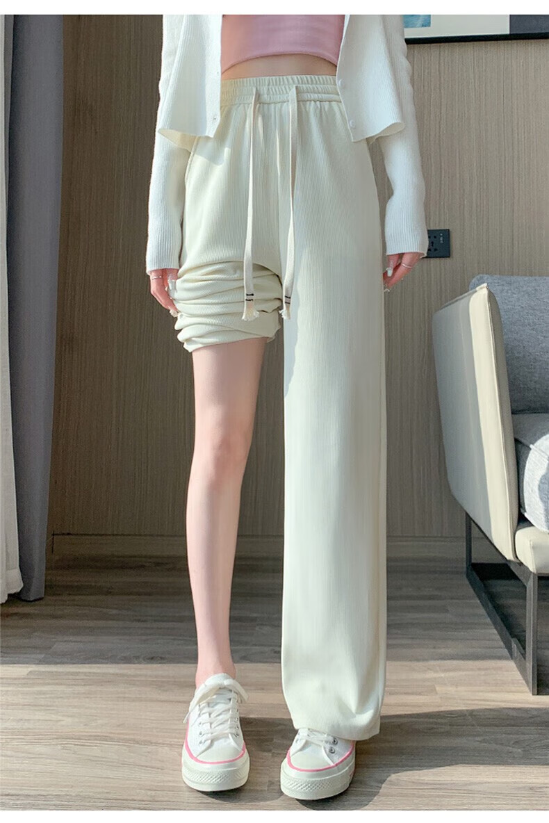 诗莉奥(SHILIAO)长裤骨纹阔腿家居裤气质高腰抽绳百搭显瘦百褶皱条纹垂感 春秋基础款-米白色 均码 【适合高155-175/臀75-100】