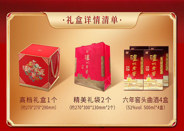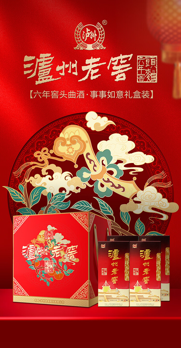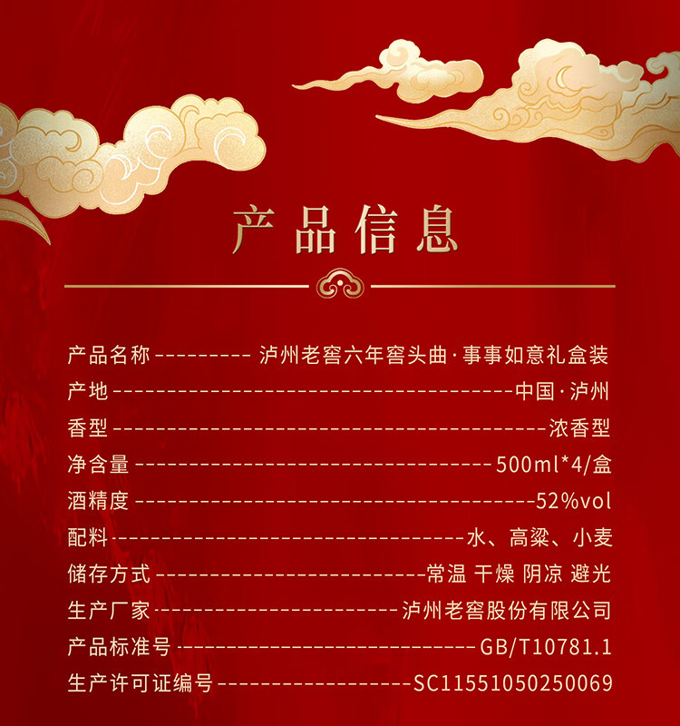 泸州老窖六年窖头曲 浓香型白酒 事事如意 52度 500mL 4瓶 礼盒装