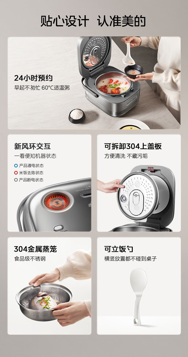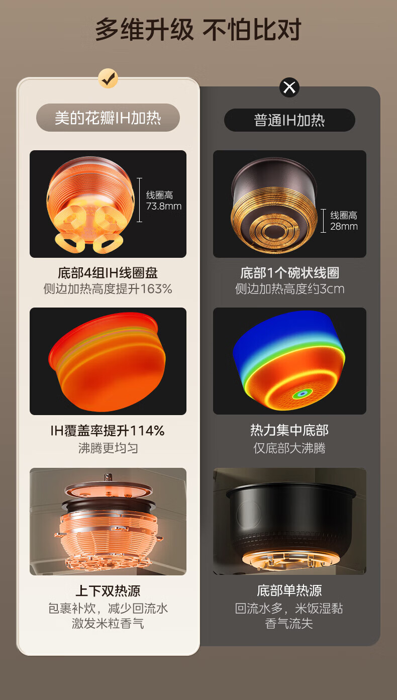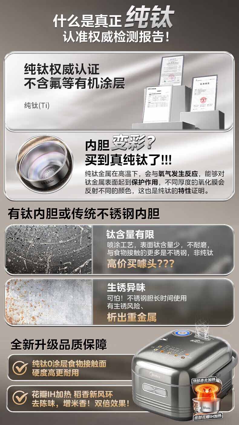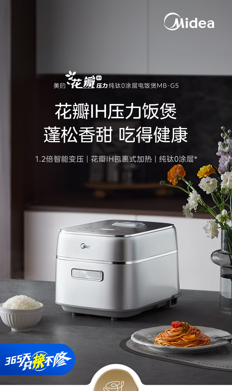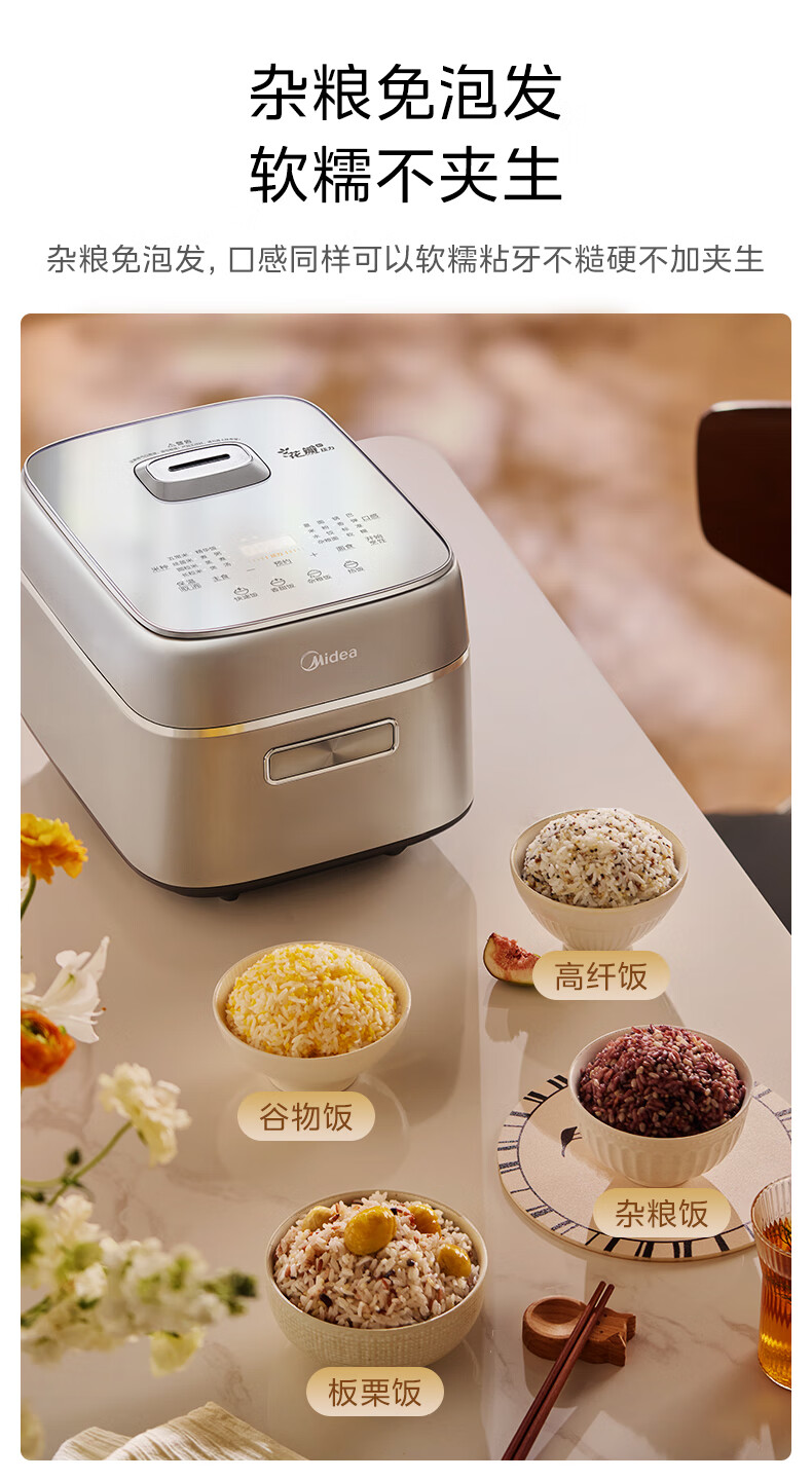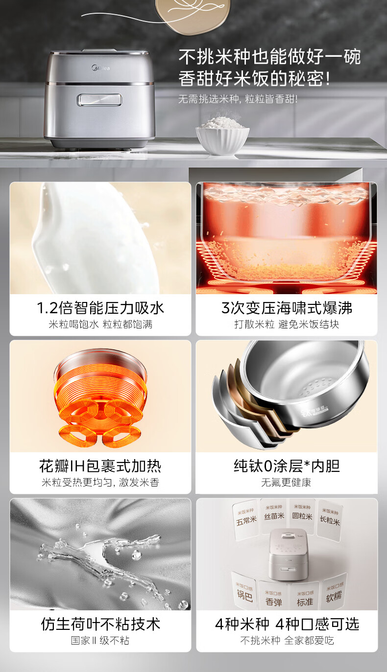 美的(Midea)电饭煲 3-4人纯钛0涂层低压电饭锅 无涂层 花瓣IH 0涂层内胆家用不锈钢智能多功能 【花瓣IH加热】MB-HS412 4L
