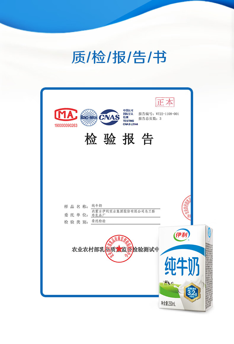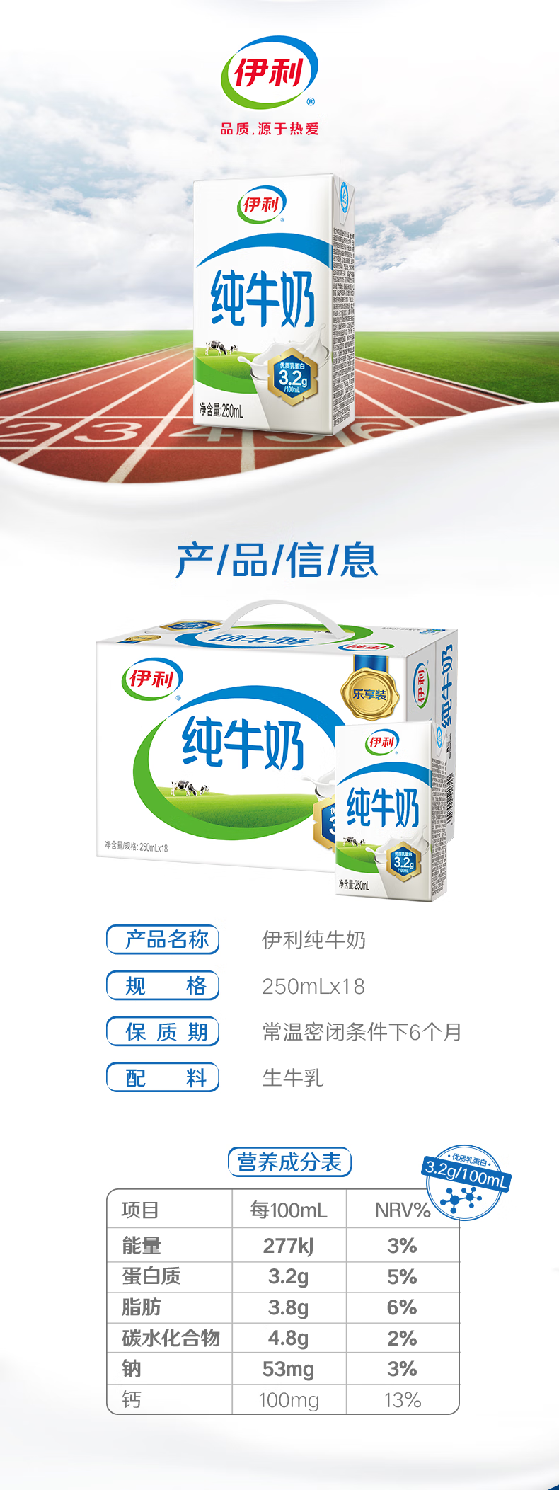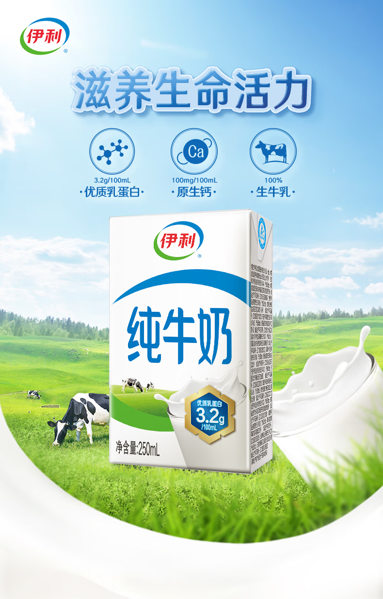 伊利纯牛奶18盒/箱 全脂牛奶优质乳蛋白 营养早餐伴侣 9月 250ml*18盒/箱