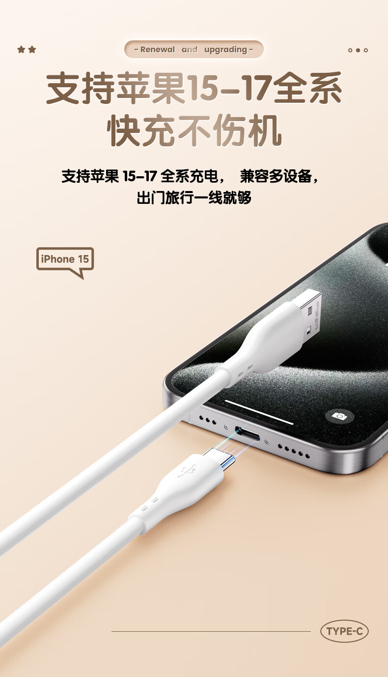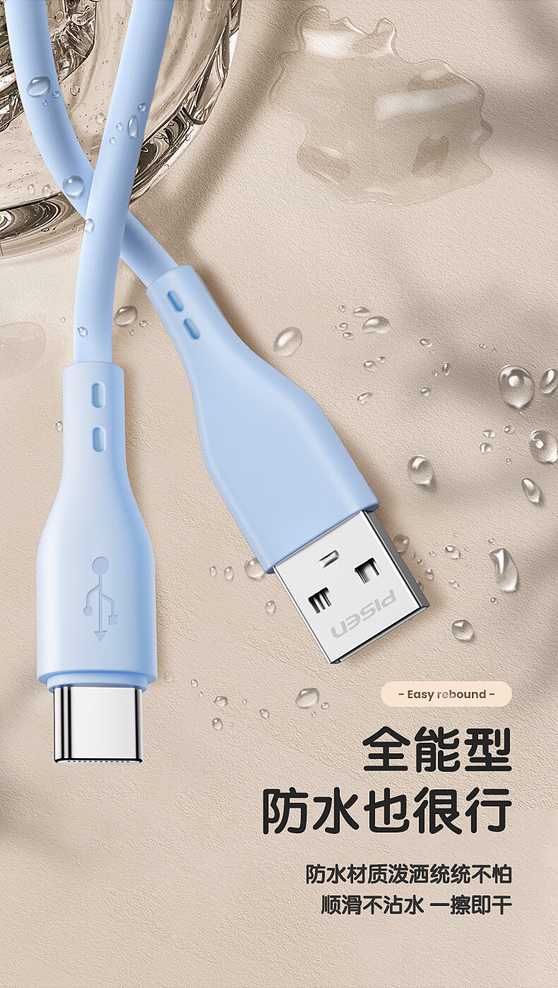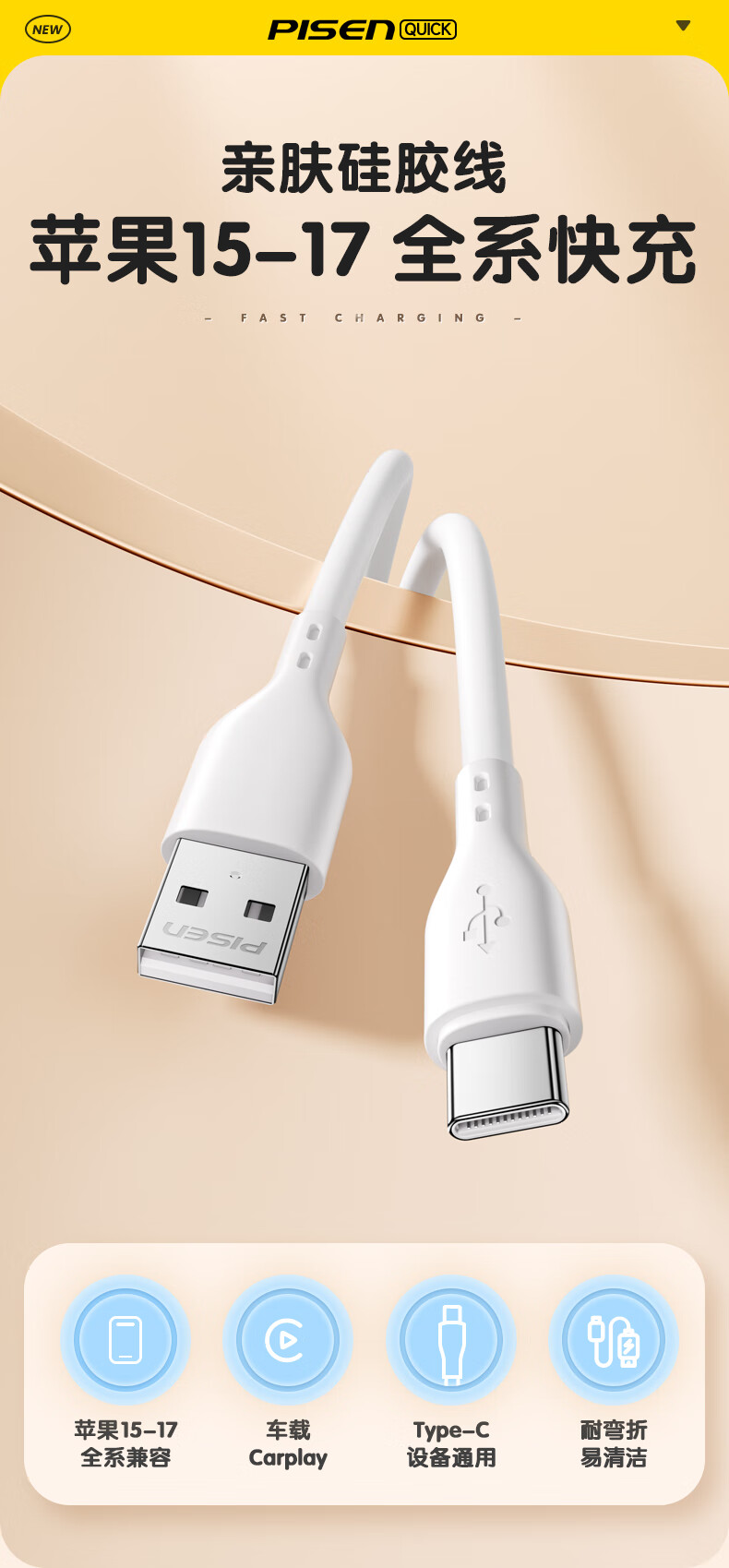 品胜苹果17充电线Type-C数据线3A快充硅胶USB-C车载Carplay适用iPhone16/15华为小米安卓手机AirPods4