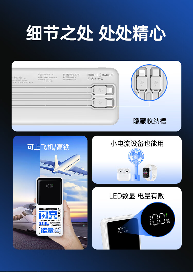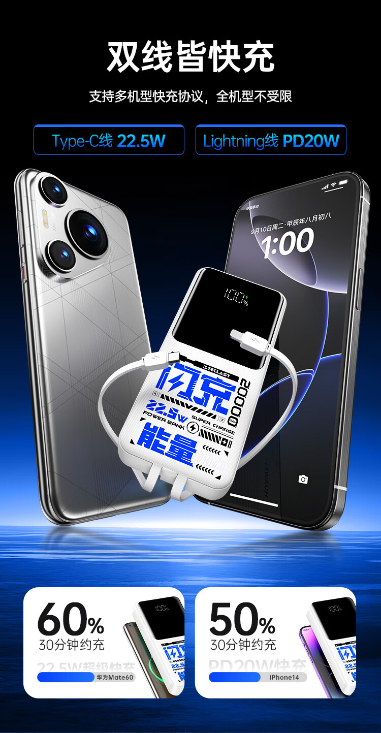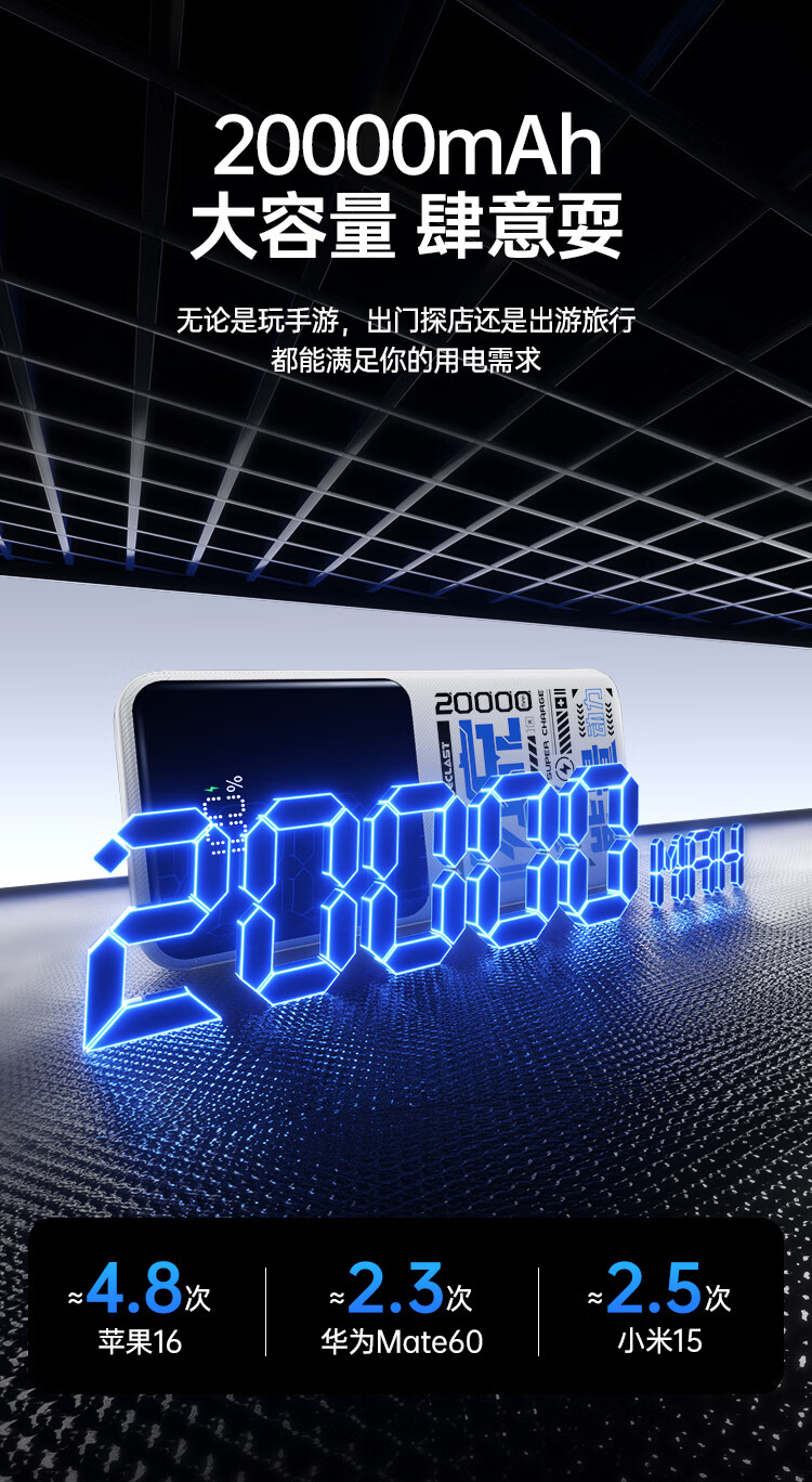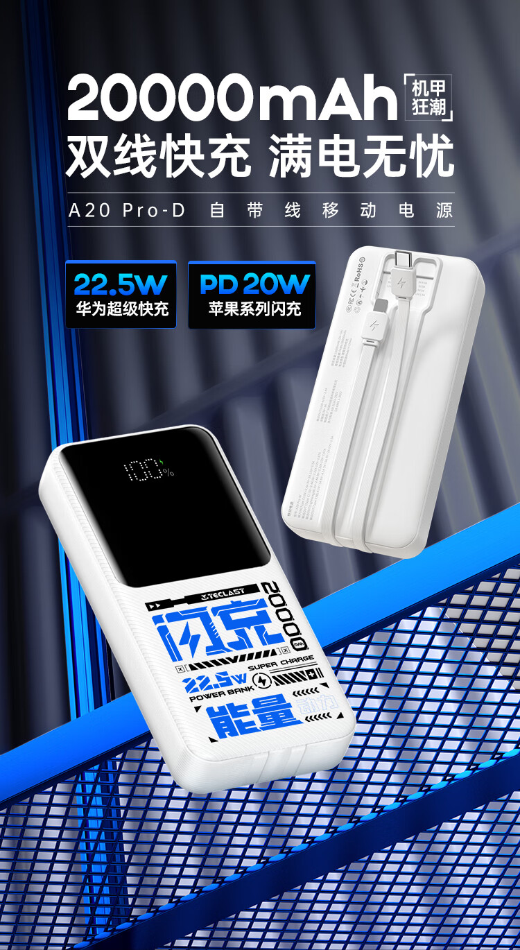 台电(TECLAST)充电宝【3C认证】20000毫安时自带双线22.5W快充可上飞机大容量移动电源适用于小米苹果安卓手机