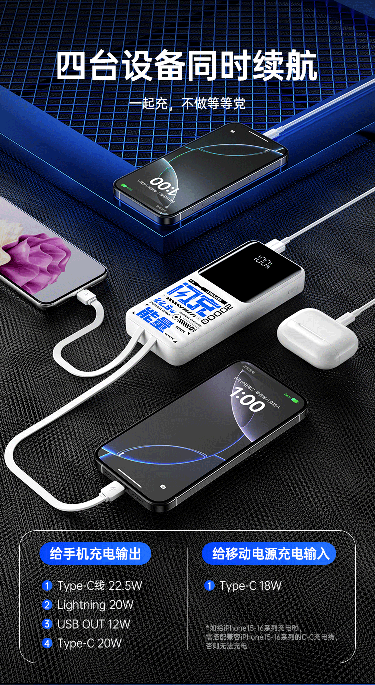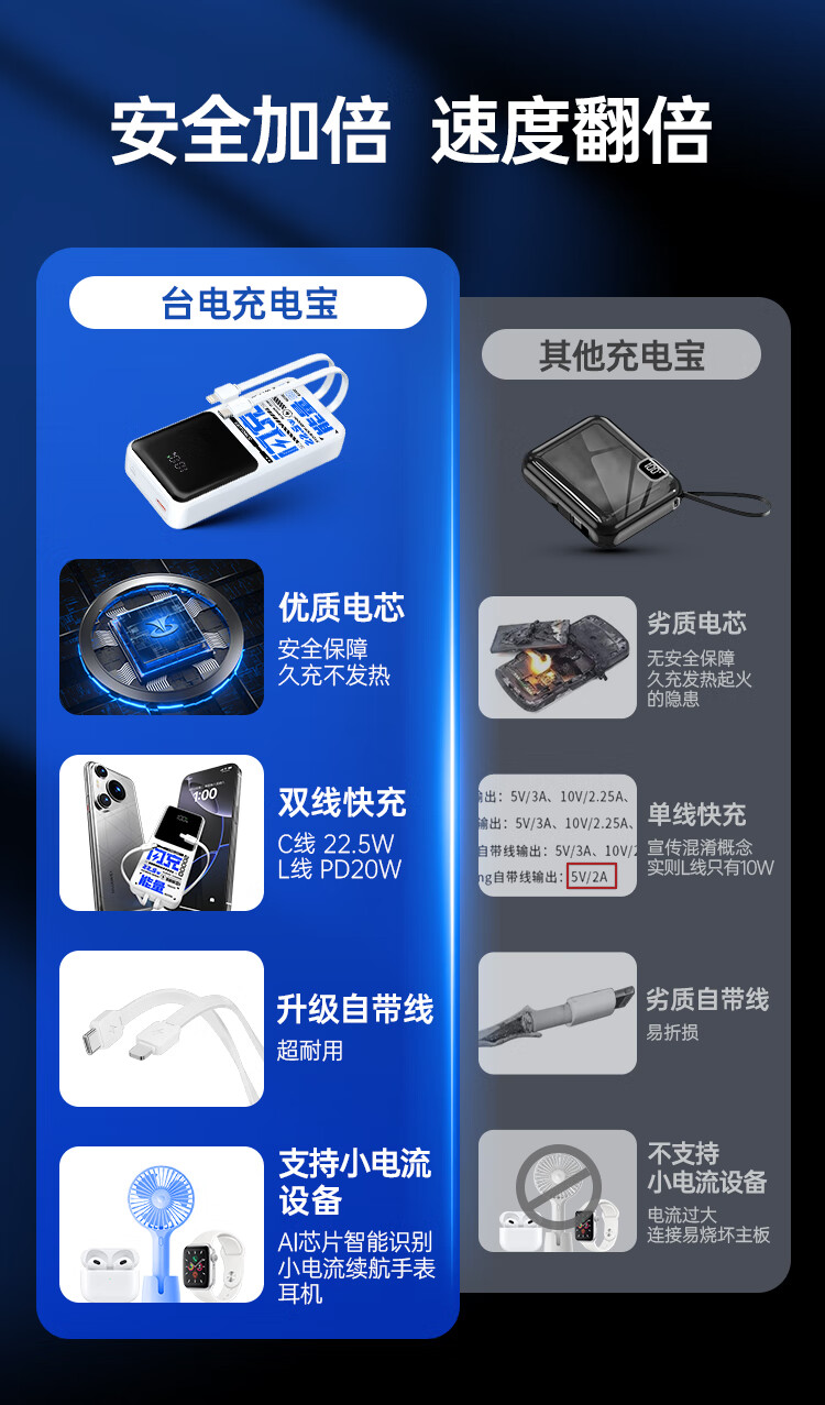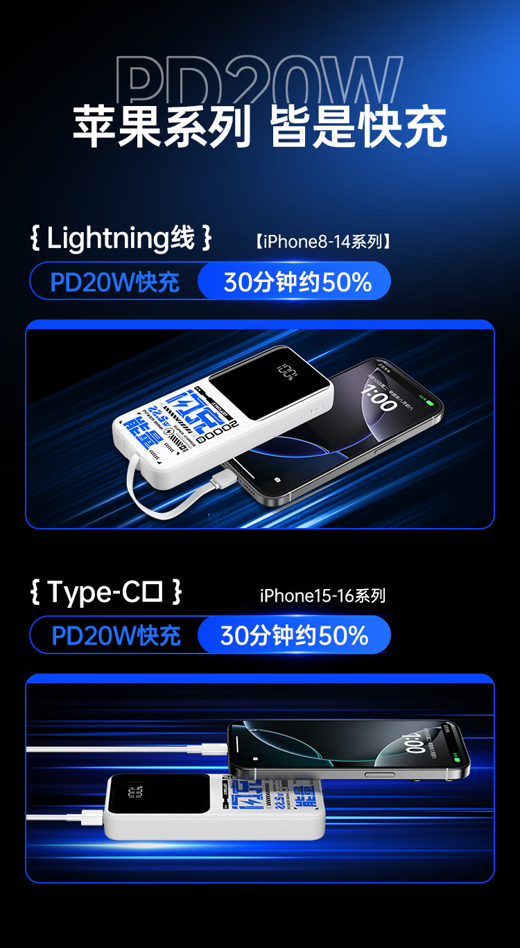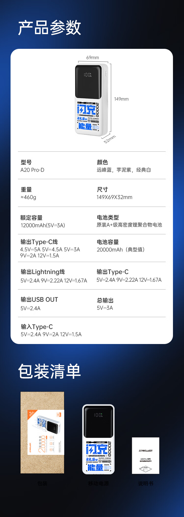 台电(TECLAST)充电宝【3C认证】20000毫安时自带双线22.5W快充可上飞机大容量移动电源适用于小米苹果安卓手机